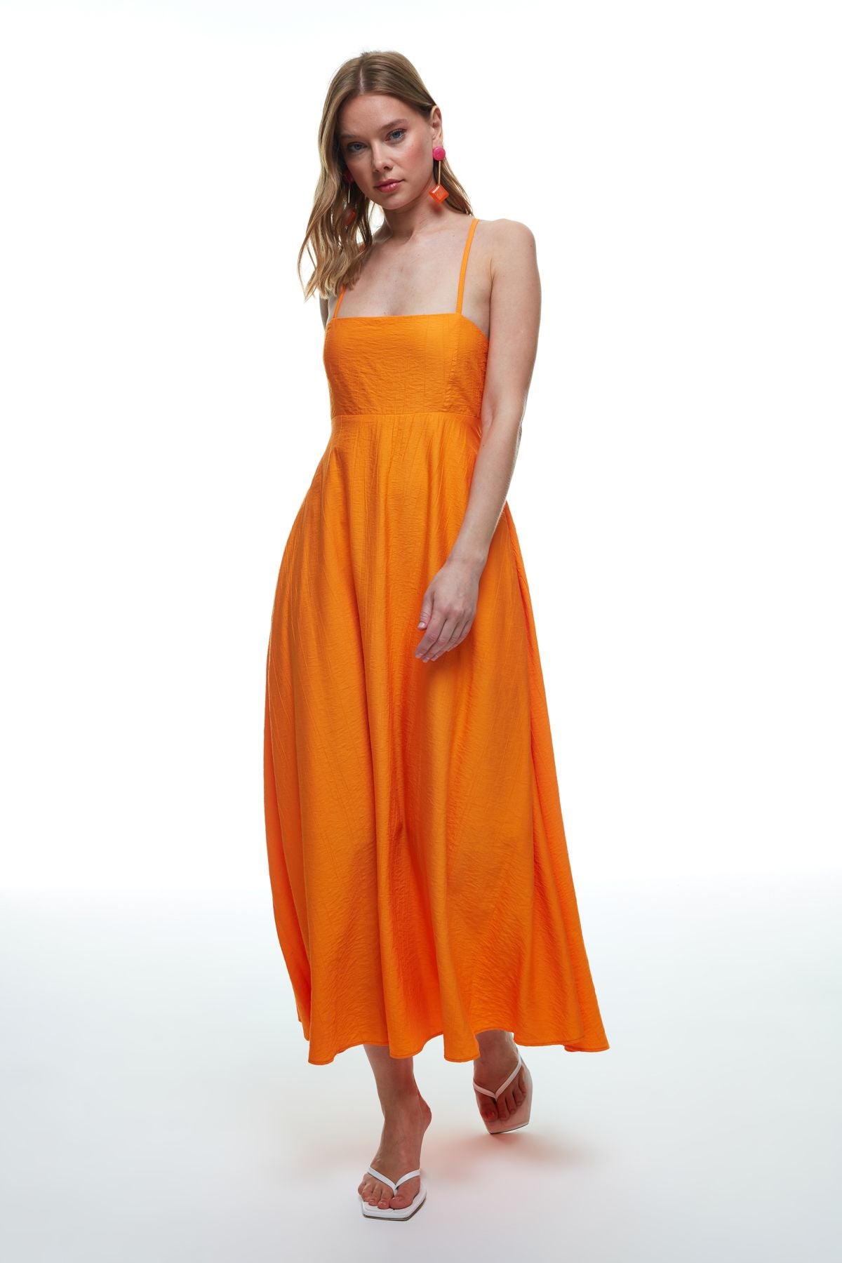 Square Neck Pocket Long Dress Orange
