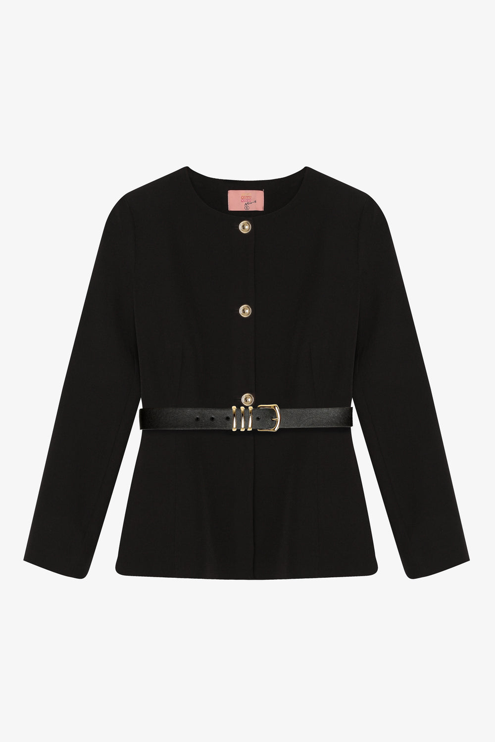 Kemer Aksesuarlı Yuvarlak Yaka Ceket Siyah