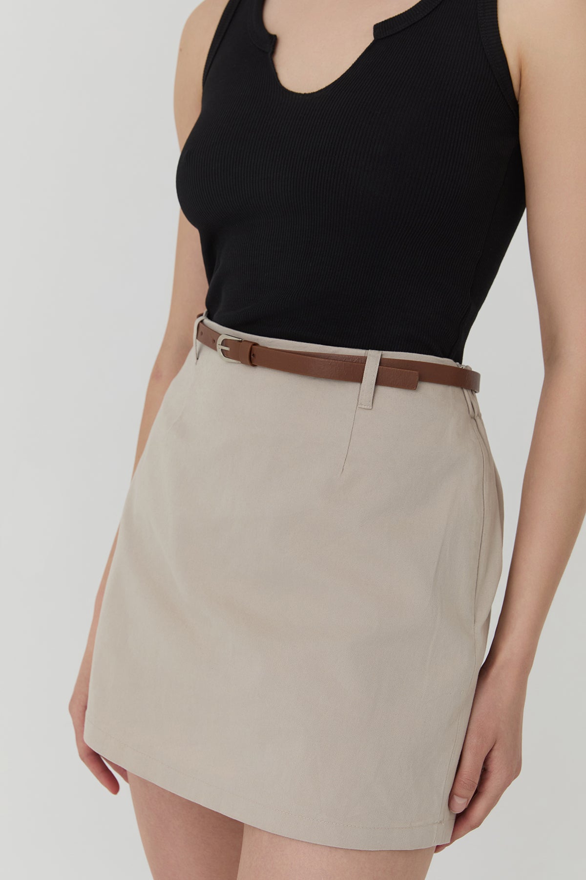 Yandan gizli fermuarlı, ince kemer aksesuarlı, içi şortlu, basic mini etek.