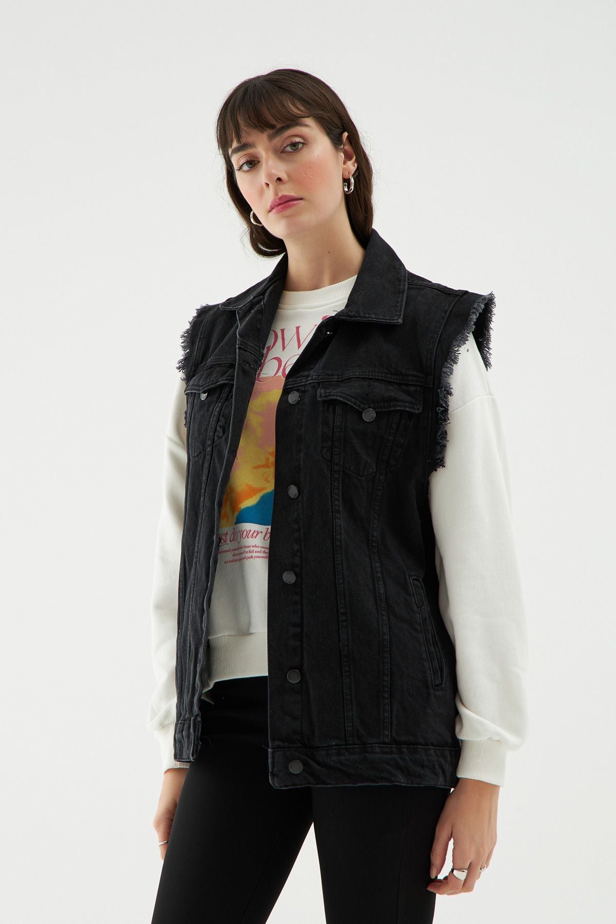 The sleeveless denim jacket model with pockets takes its place among the denim clothing trends with its tassel details. By completing the Boyfriend sleeveless denim jacket model with jeans, you can create a denim look and create a sporty style. With metallic button
