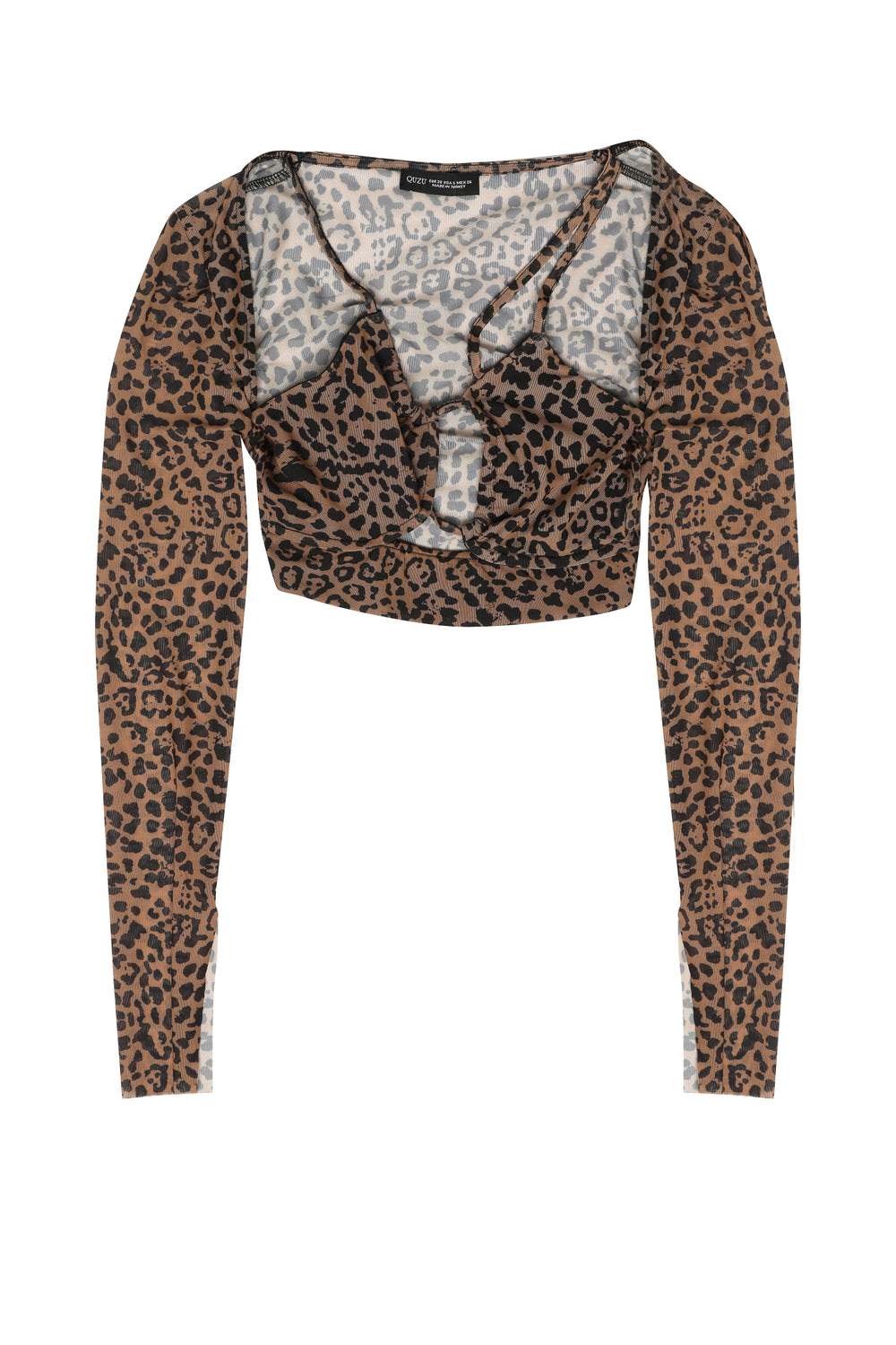 Leopard print blouse with long sleeves, lined chest, low-cut shoulder and collar, transparent design, body-hugging fit.