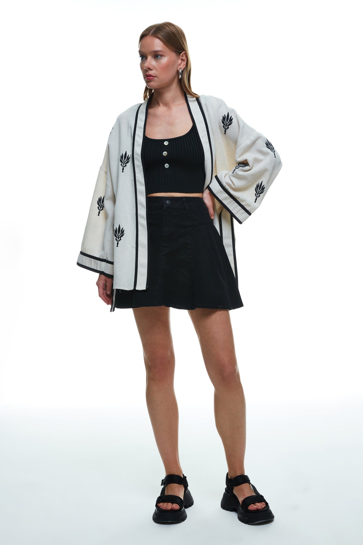 Short kimono in a linen blend with embroidery details and a tie waist.