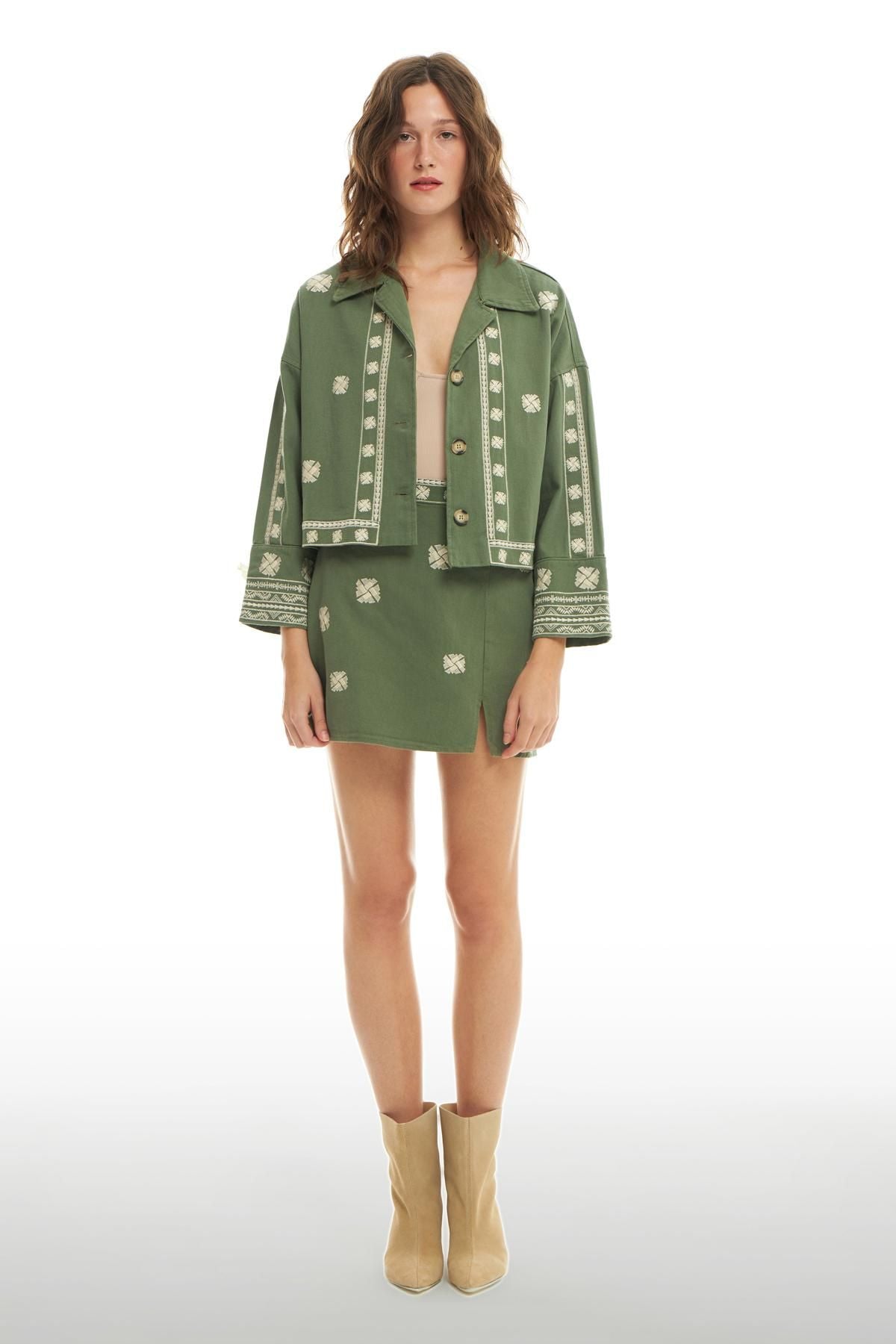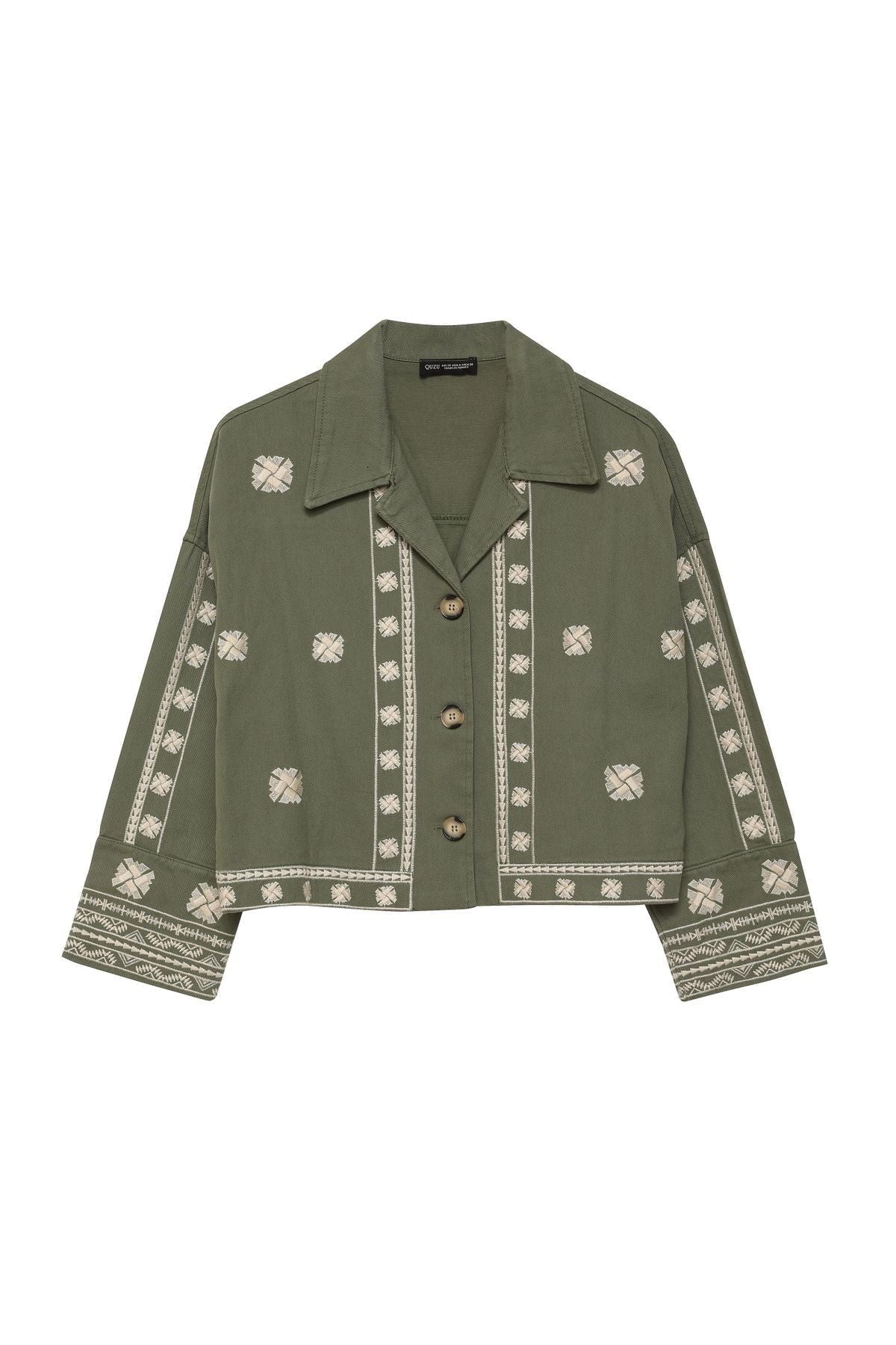 Embroidered jacket with an oversized fit, long sleeves, large buttons.