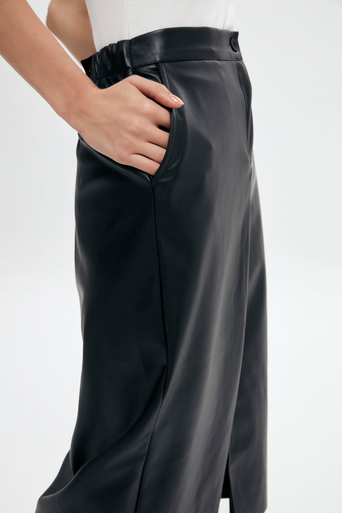 Midi leather skirt with high waist, front slit, double pocket detail, button closure, inner tuck.