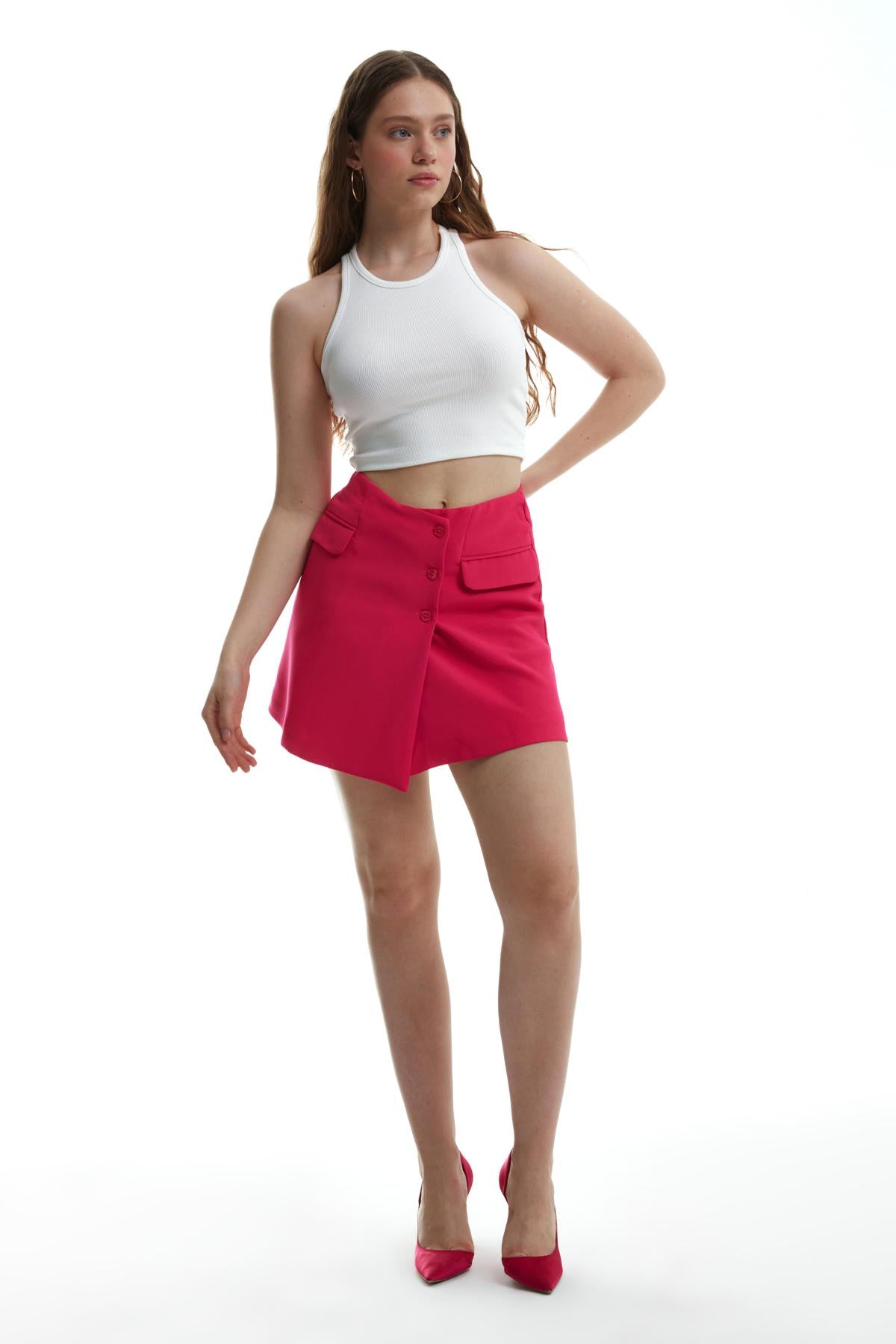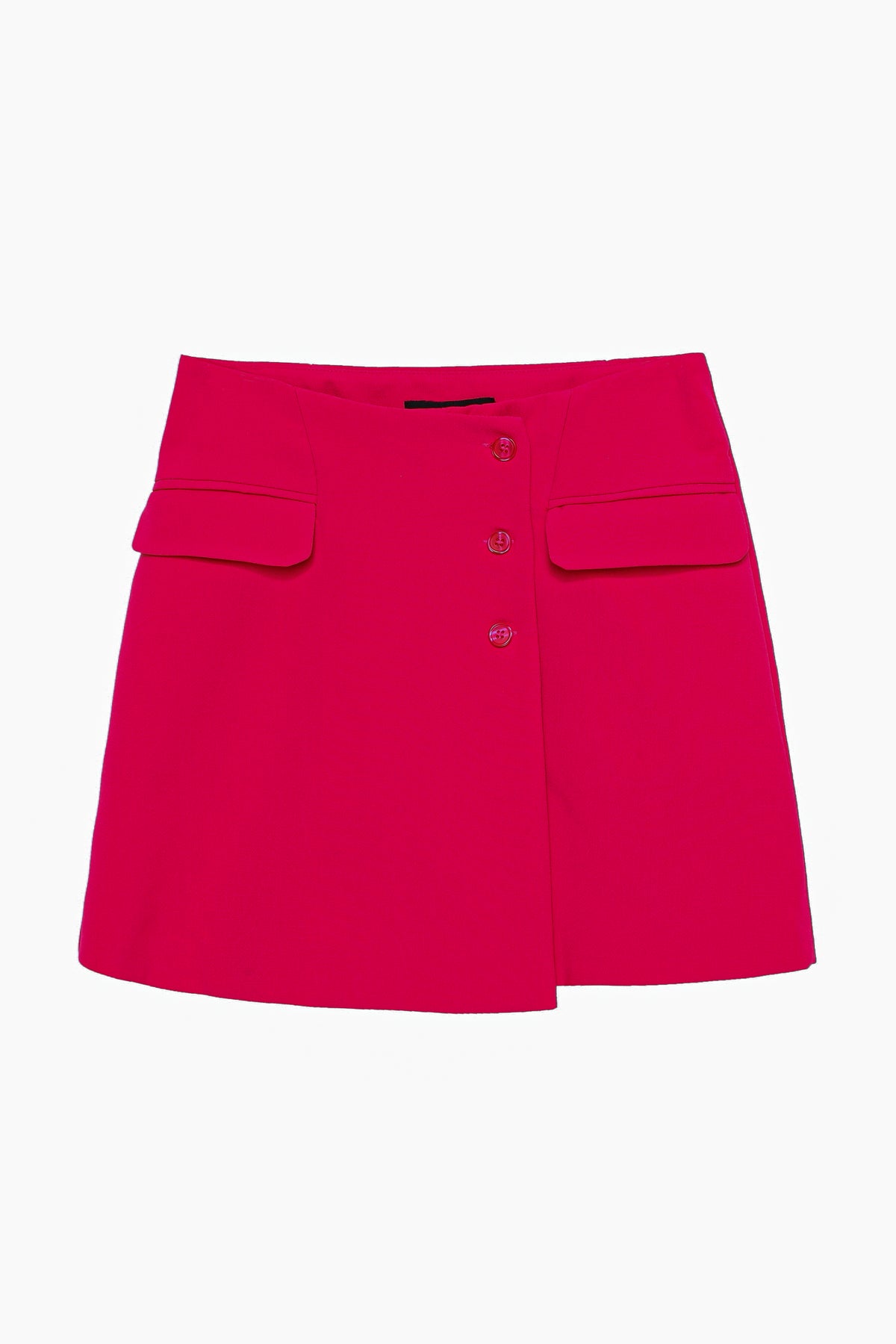 Lined, wrapover mini skirt with two front pockets, a button-up front.