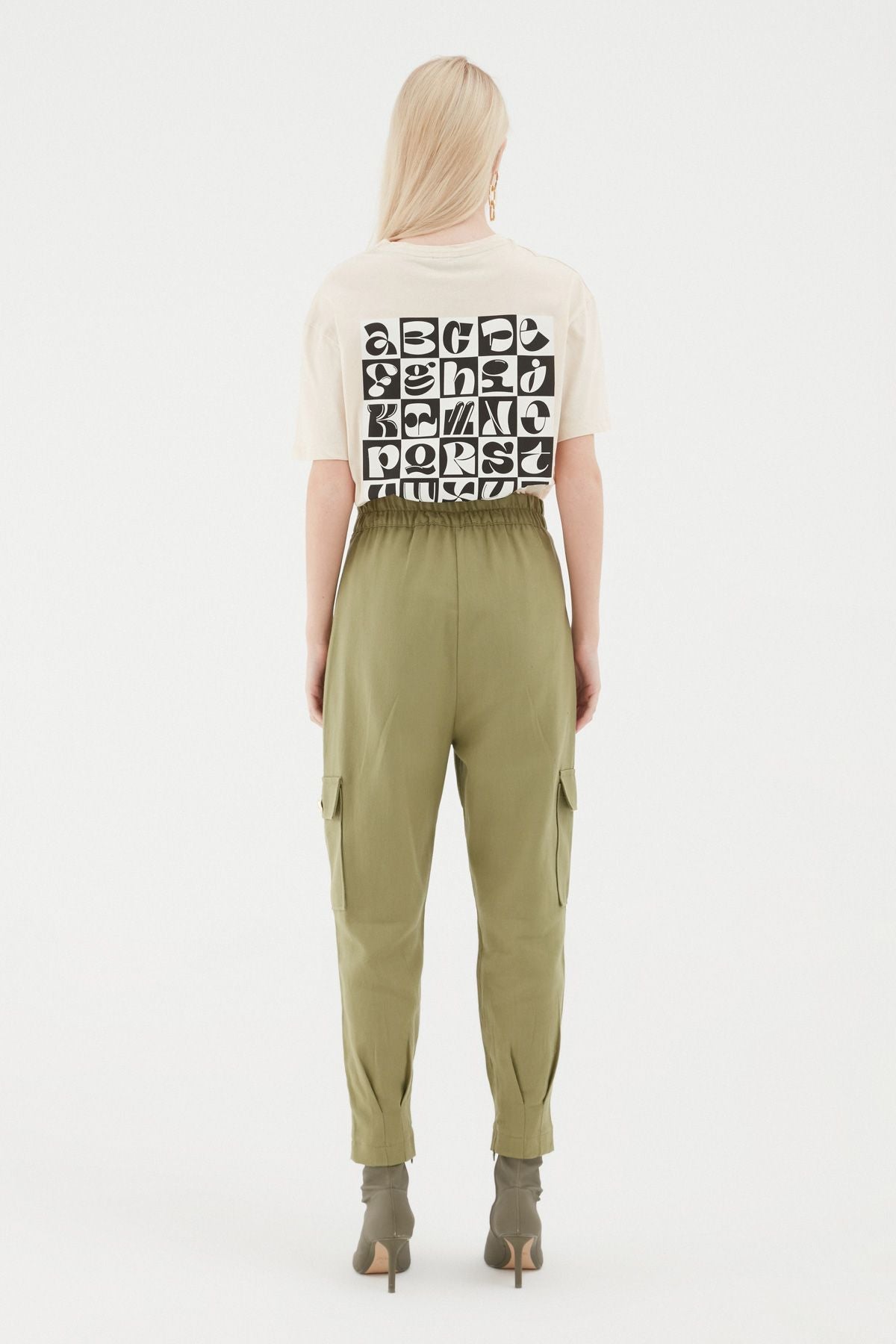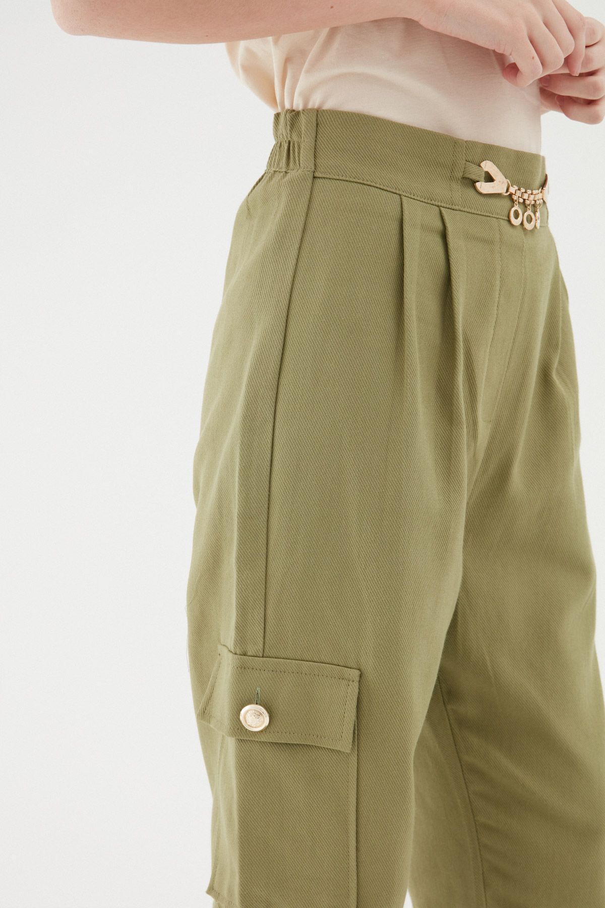 Cargo pocket trousers with 100% cotton content can make a difference in their combinations with their cool appearance and comfortable wear. You can complete your look by combining the ultra-high waist trousers model, which attracts attention with its buttons and accessories, with the shirt model of the same color. It has a hidden zipper and pleated legs.