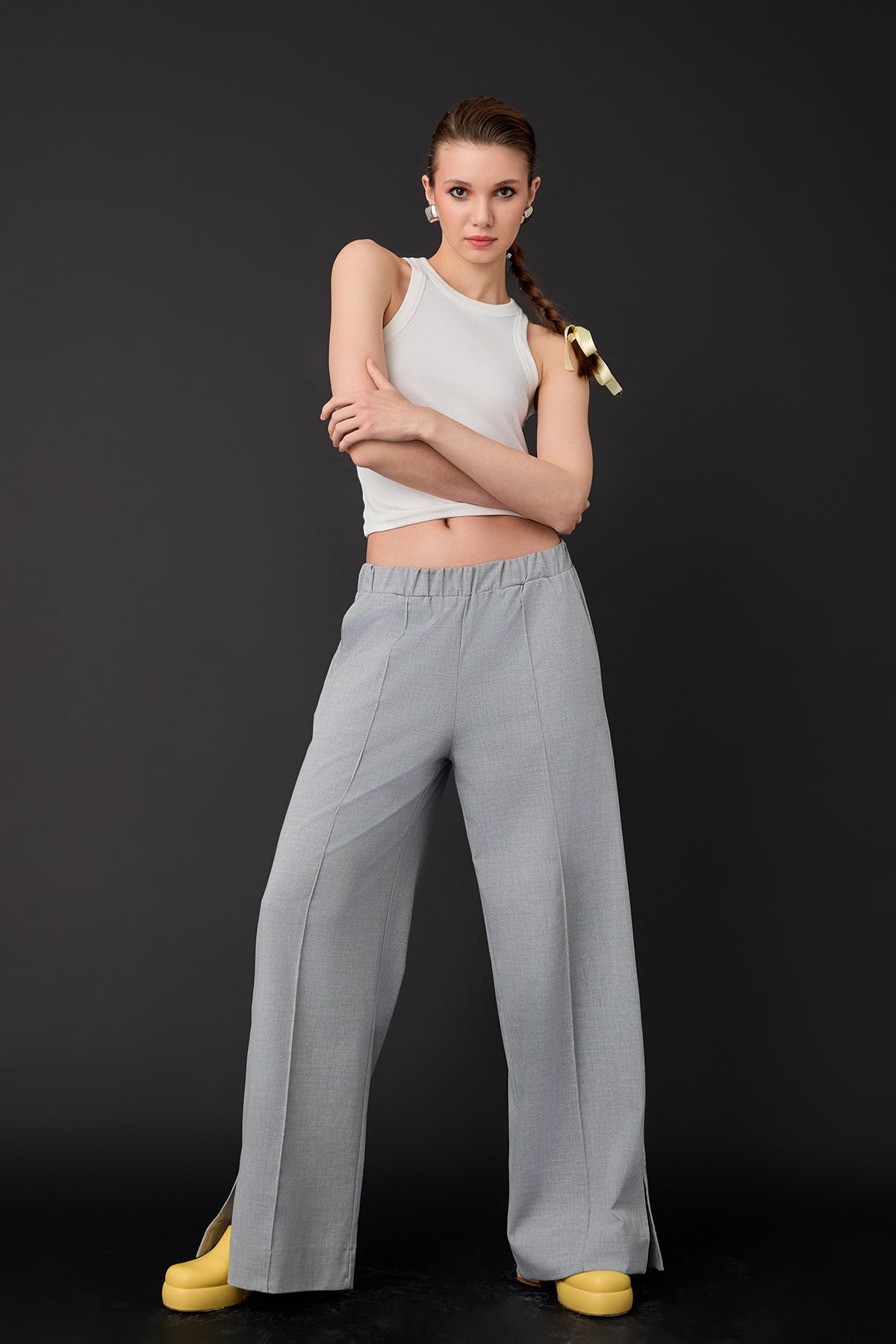 Yüksel bel, belİ lastİklİ, çİft cep detaylı, paçası mİnİ yırtmaçlı, pens detaylı pantolon.