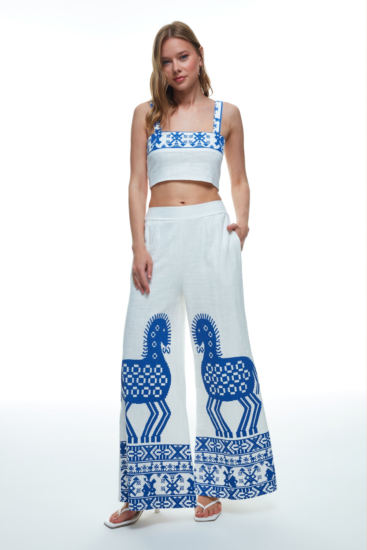 100% Cotton, high waist, elastic waist, lined shorts, embroidery detail, wide leg trousers.