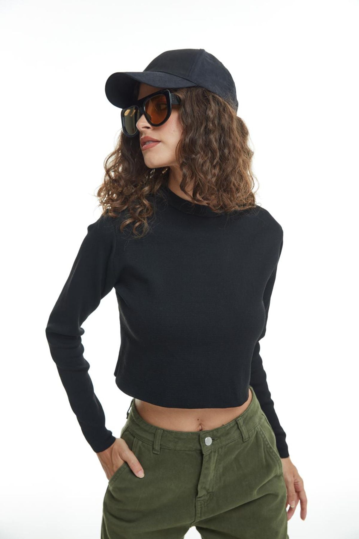 Stand-up collar, long sleeve, cropped, body-hugging fit, tie back and low-cut knitwear.