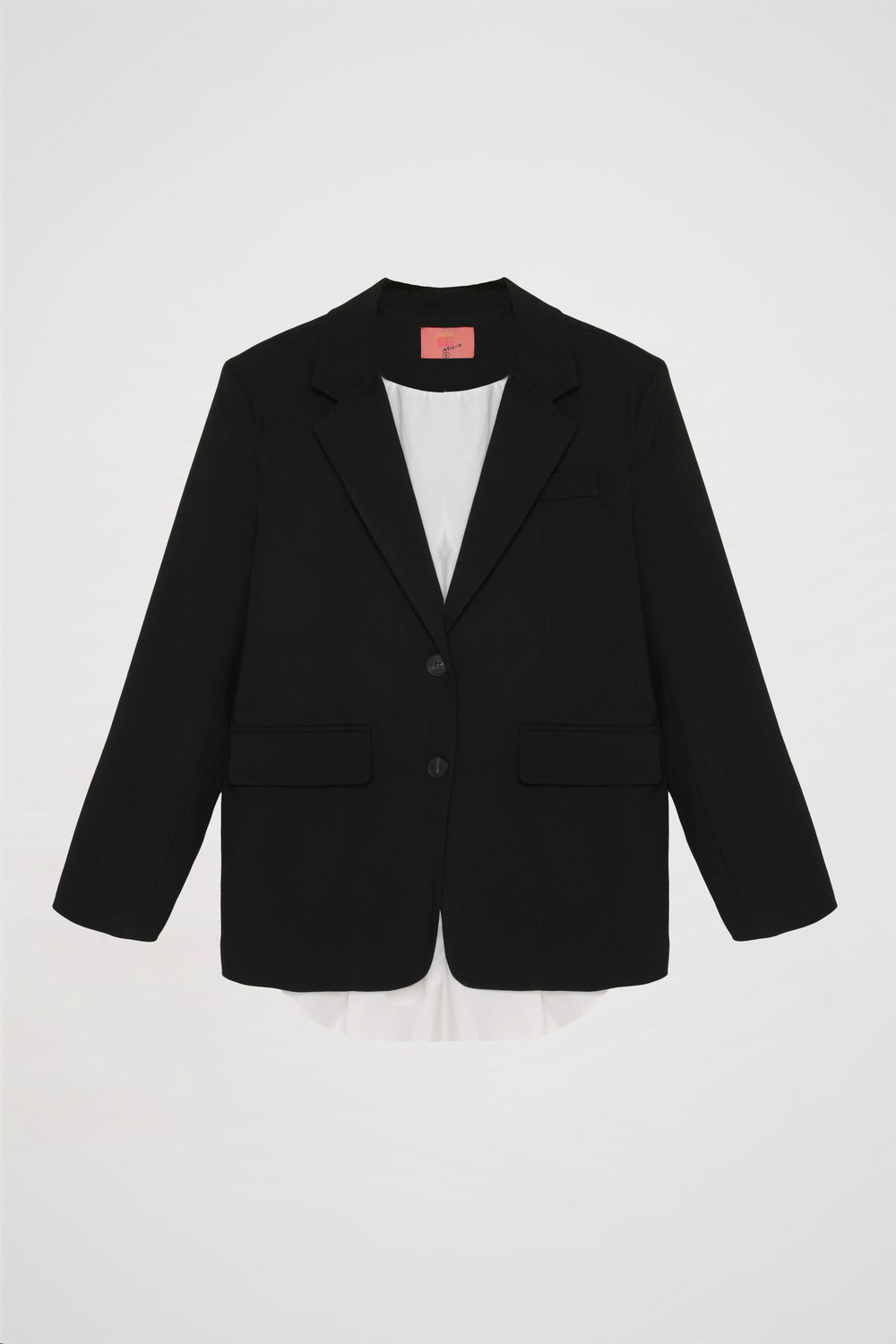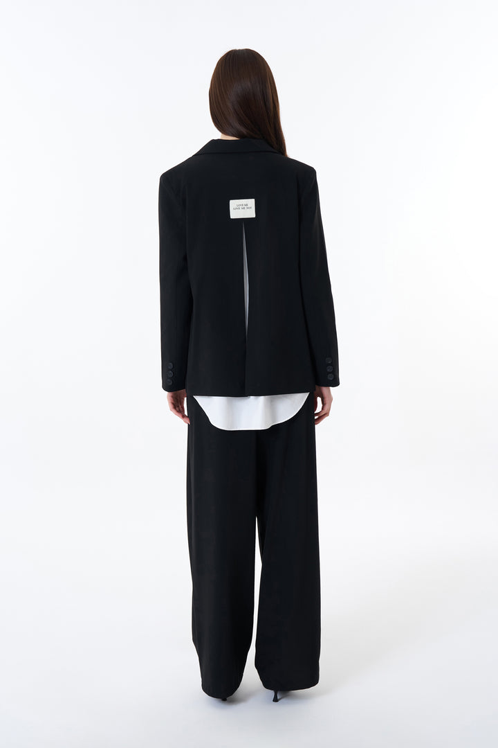 İçi astarlı, kruvaze yakalı, tek sıra düğme kapamalı, kapaklı cepli, sırt kısmında “LOVE ME LOVE ME NOT” yazılı etiket ve yırtmaç detaylı blazer ceket.
