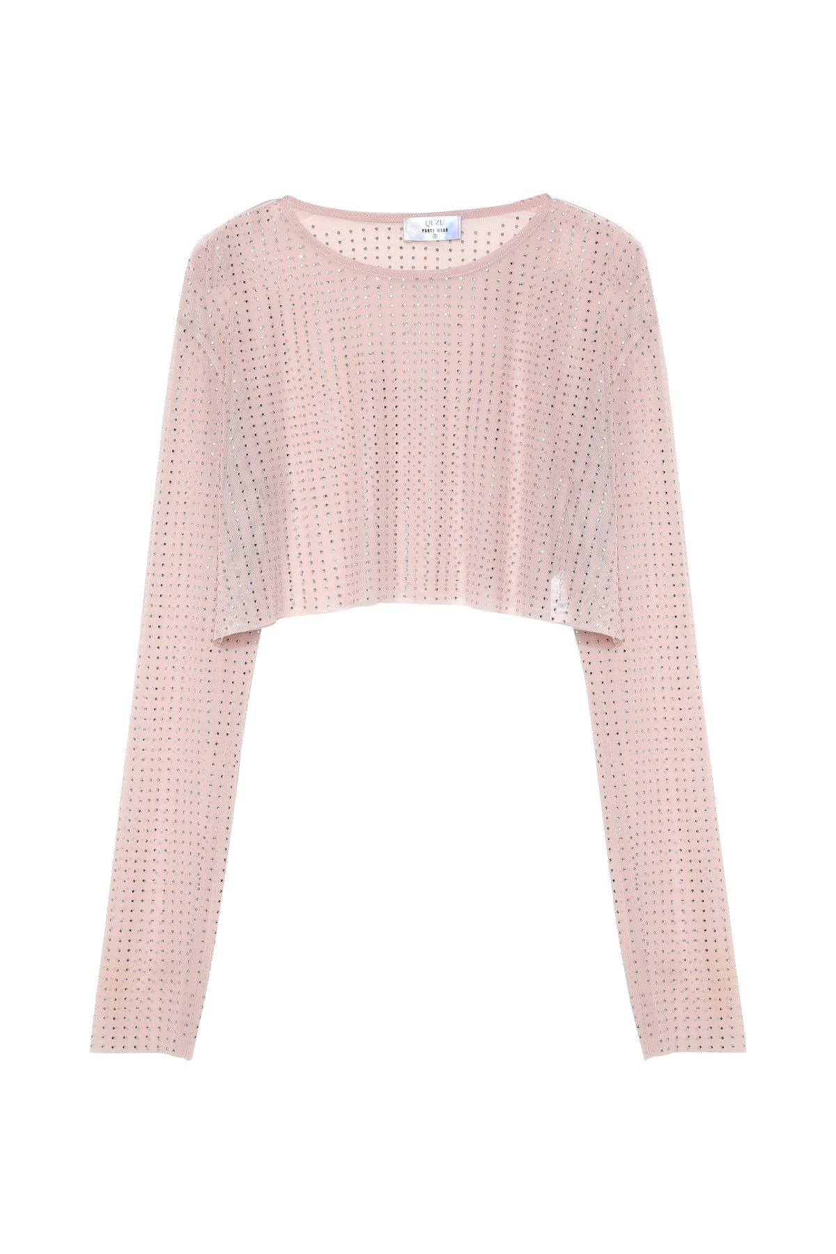 Transparan tül detaylı, uzun kollu, taşlı, crop bluz.
