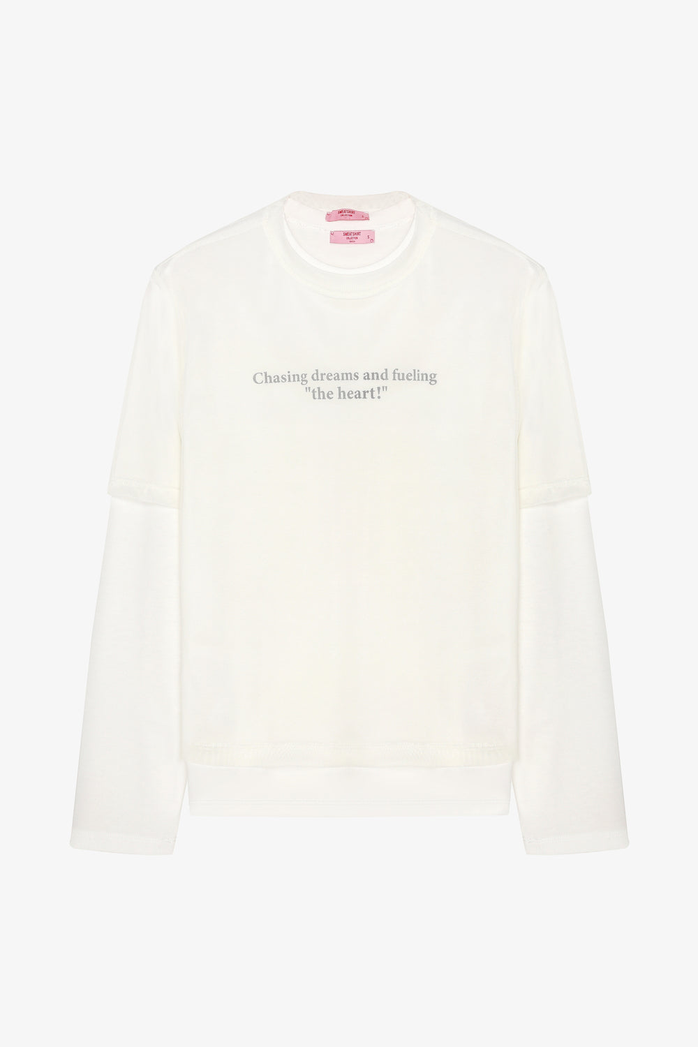 Üzeri yazı baskılı, bisiklet yaka, iç içe kol garni detaylı, uzun tül kollu, oversize sweatshirt.