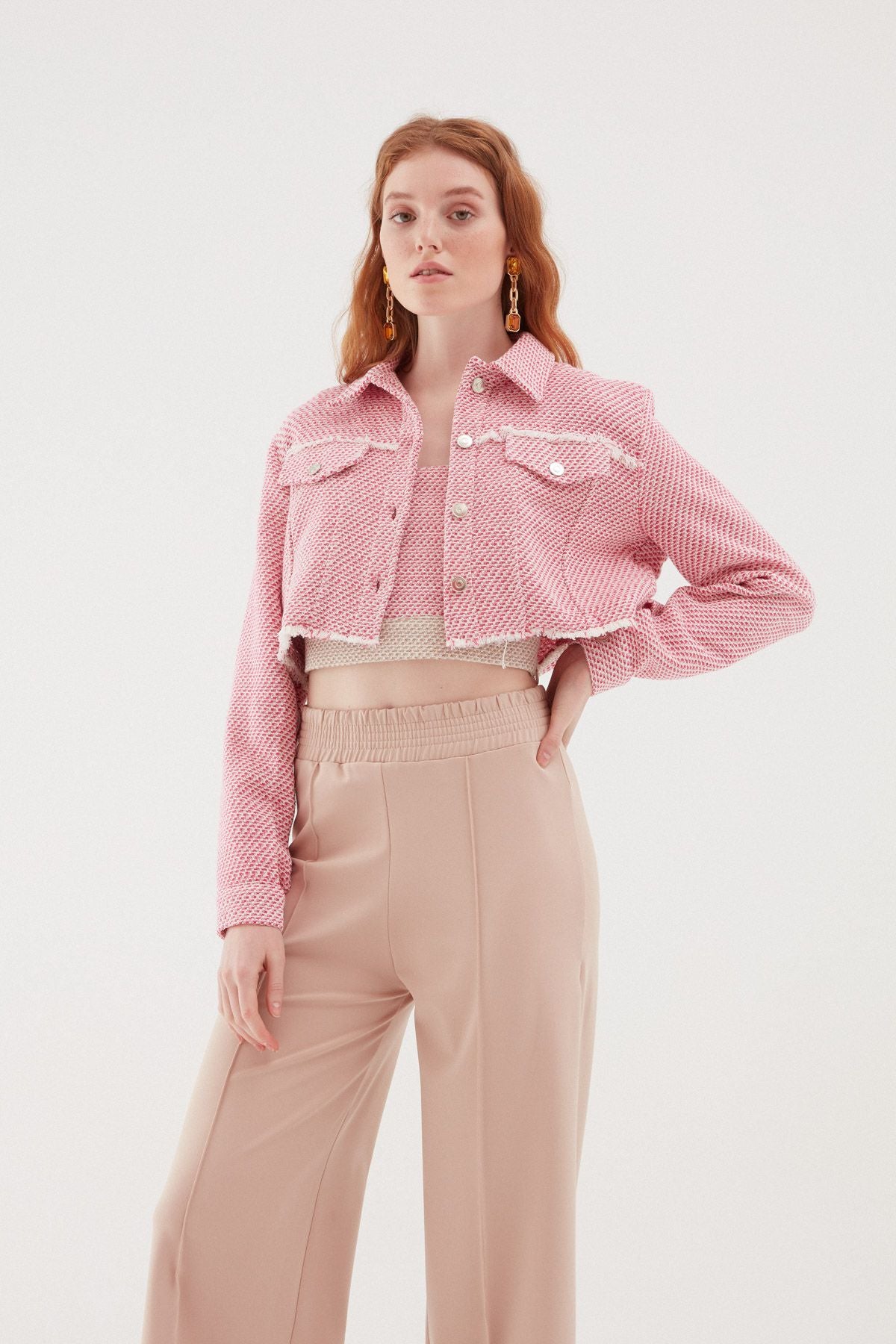 The tweed cropped jacket model, which looks lively with its tassel and pocket-like detail, takes its place among the wearable pieces. The tasseled crop jacket model draws attention with its cotton content and metallic button details as well as its color.