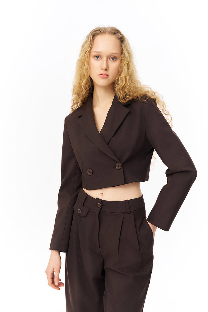Kruvaze yaka, içi astarlı, uzun kollu, çift düğme detaylı, crop blazer ceket