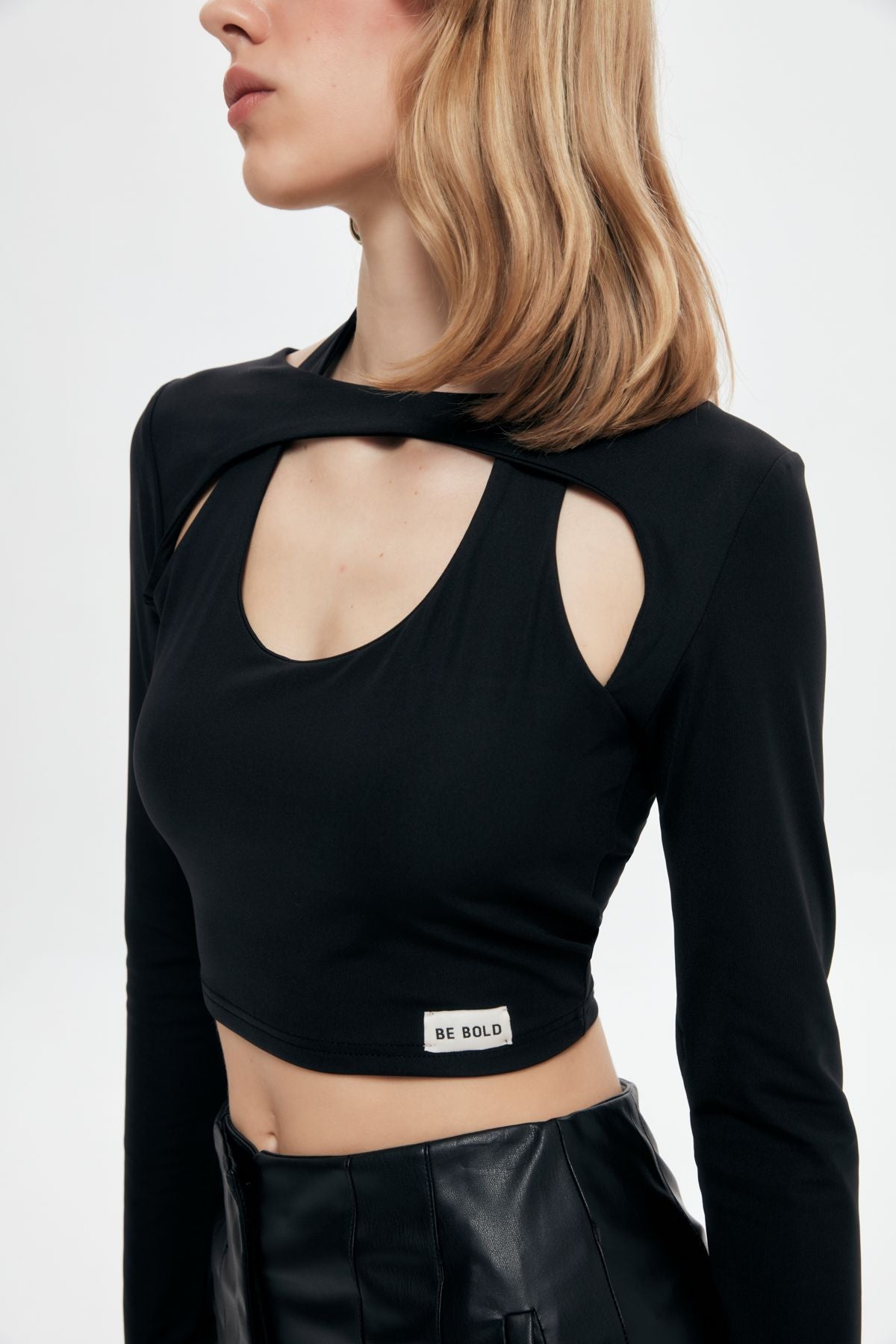 Long sleeve, body-hugging fabric, cropped blouse with collar detail.