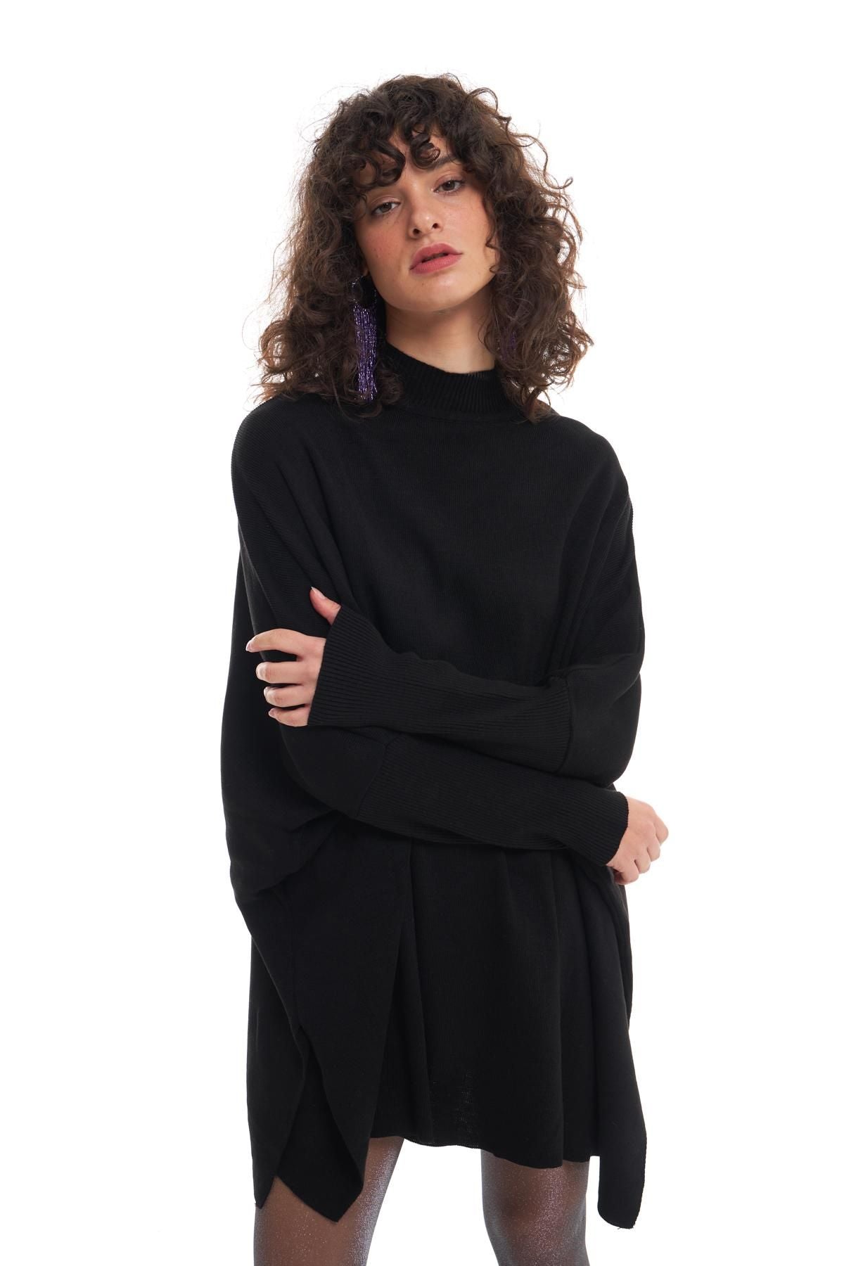 Half turtleneck, long sleeve, relaxed fit, bat sleeve, side slits, mid-length, oversized sweater.