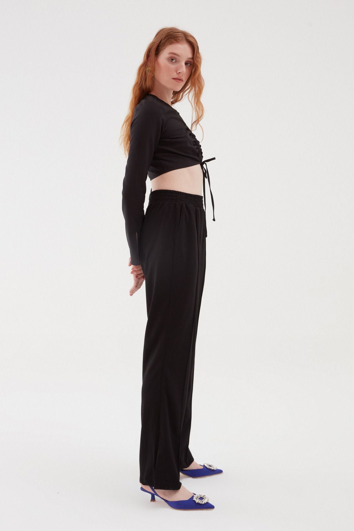Our wide leg trousers model with elastic waistband, which you can choose for your daily use or sports activity plans, stands out with its slit detail. With its comfortable fit structure, the high waist and wide-leg trousers model with pockets will offer comfort in movement.