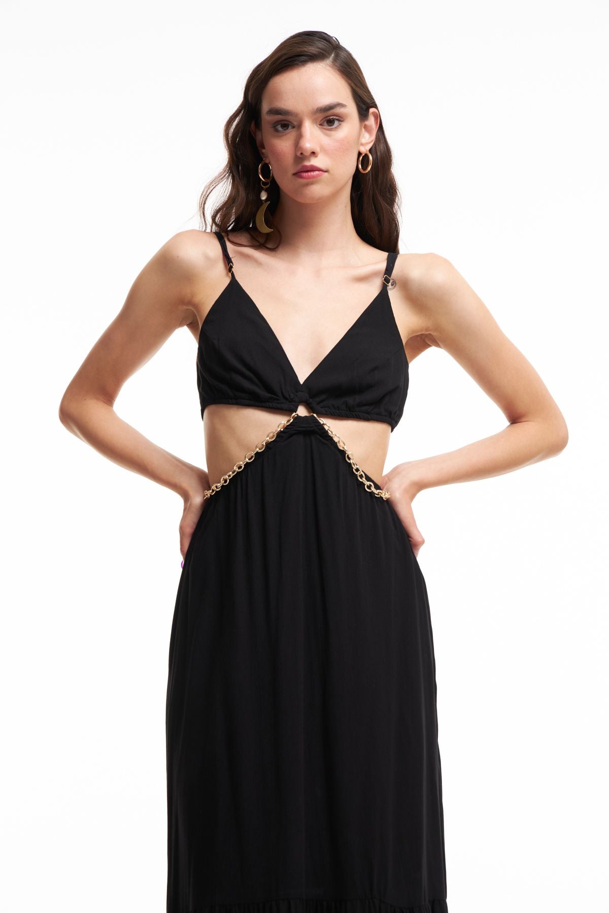 The long dress model, with its chain details on the waist, allows you to get a sophisticated look at dinner or at an invitation. The long dress with straps, which is always a savior with its black color, offers a noble and elegant look with its color and enriching details. The ruffle details on the hem of the 100% viscose long dress with a low-cut neckline add movement to its style, while the cut-out cut at the waist offers a more feminine look. You can adjust the straps of the frilly long dress model according to your shoulder length. It is lined and has a zipper on the back.