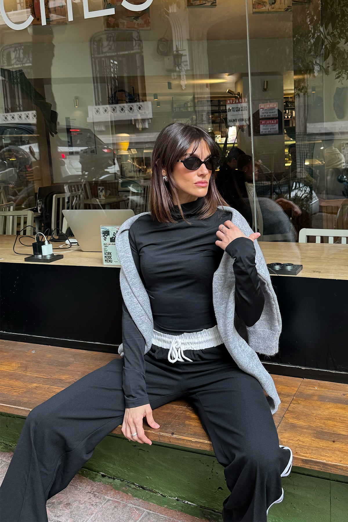 Etiket Detaylı Şerit Garnili Bol Paça Pantolon Siyah