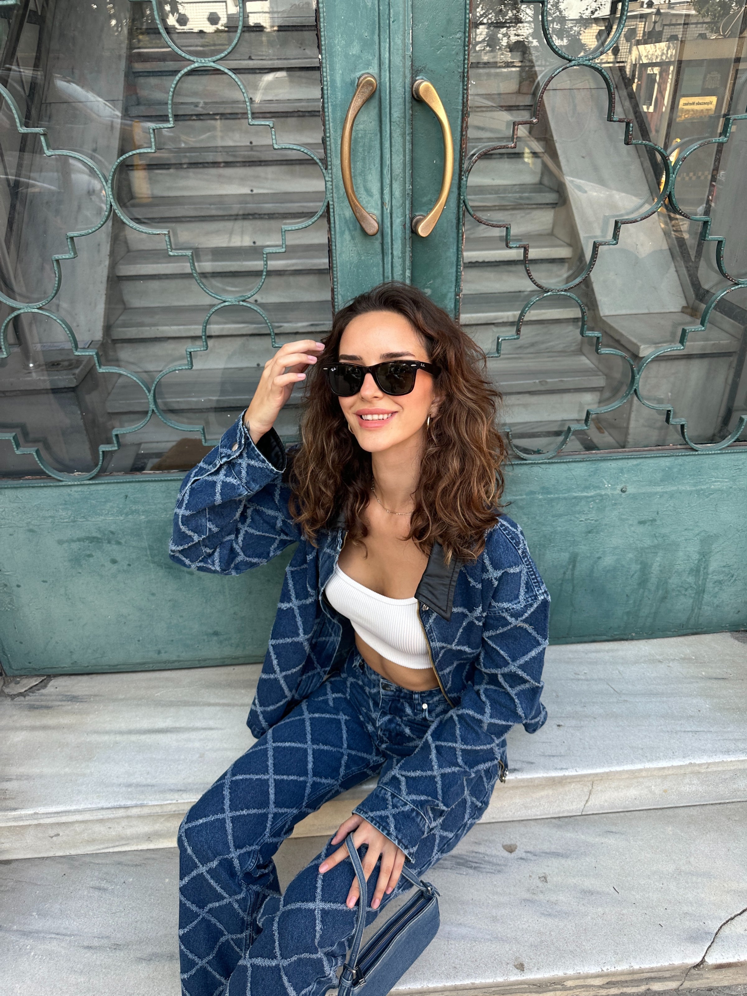 Baklava Desenli Deri Yaka Fermuarlı Kot Ceket Mavi