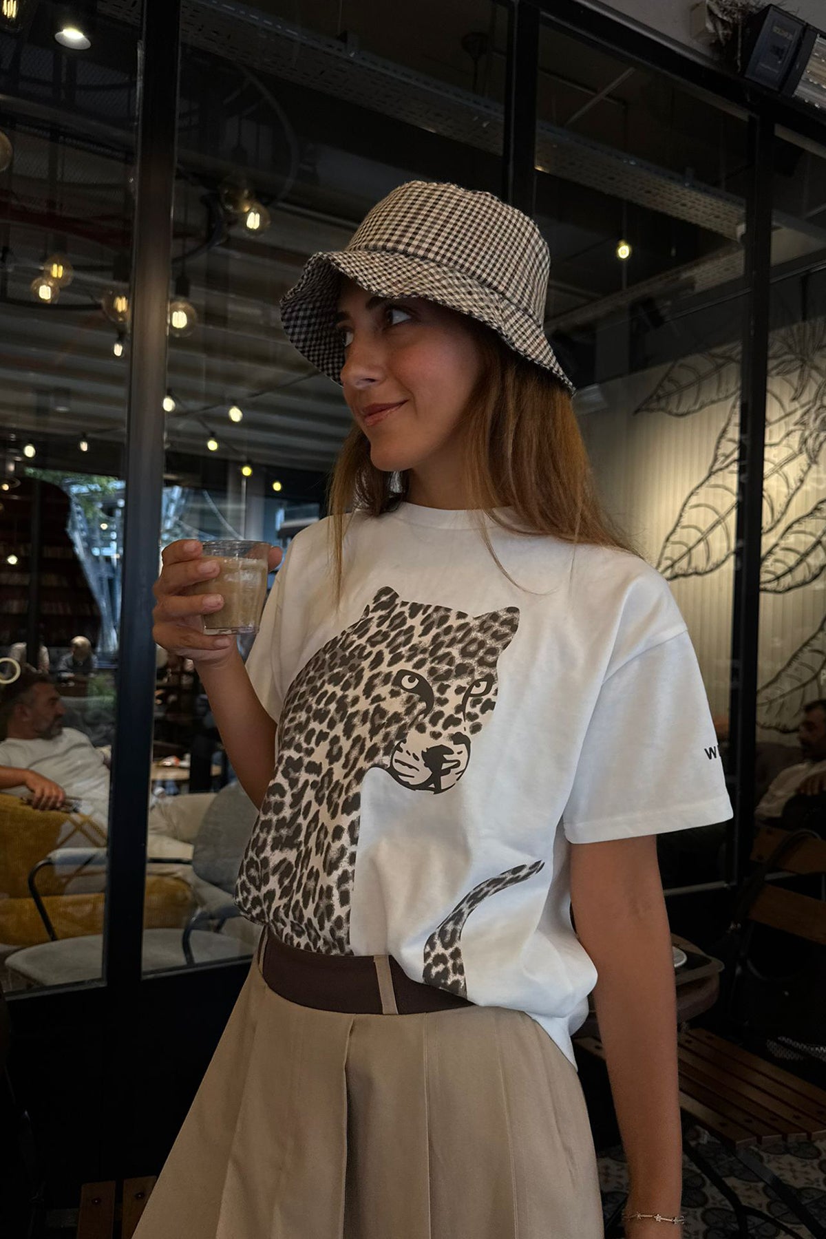 Kolu Yazılı Leopar Desenli Tişört Ekru