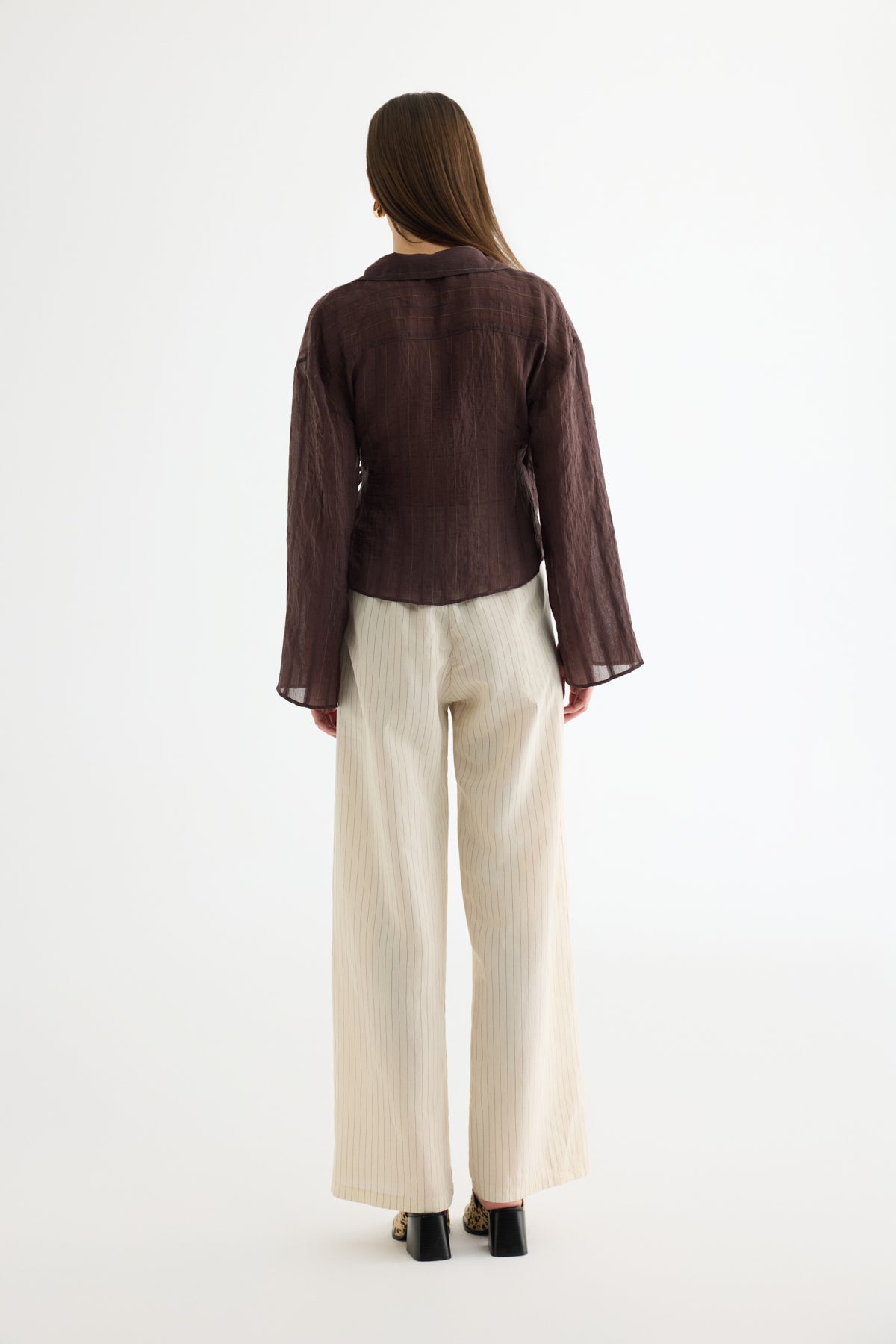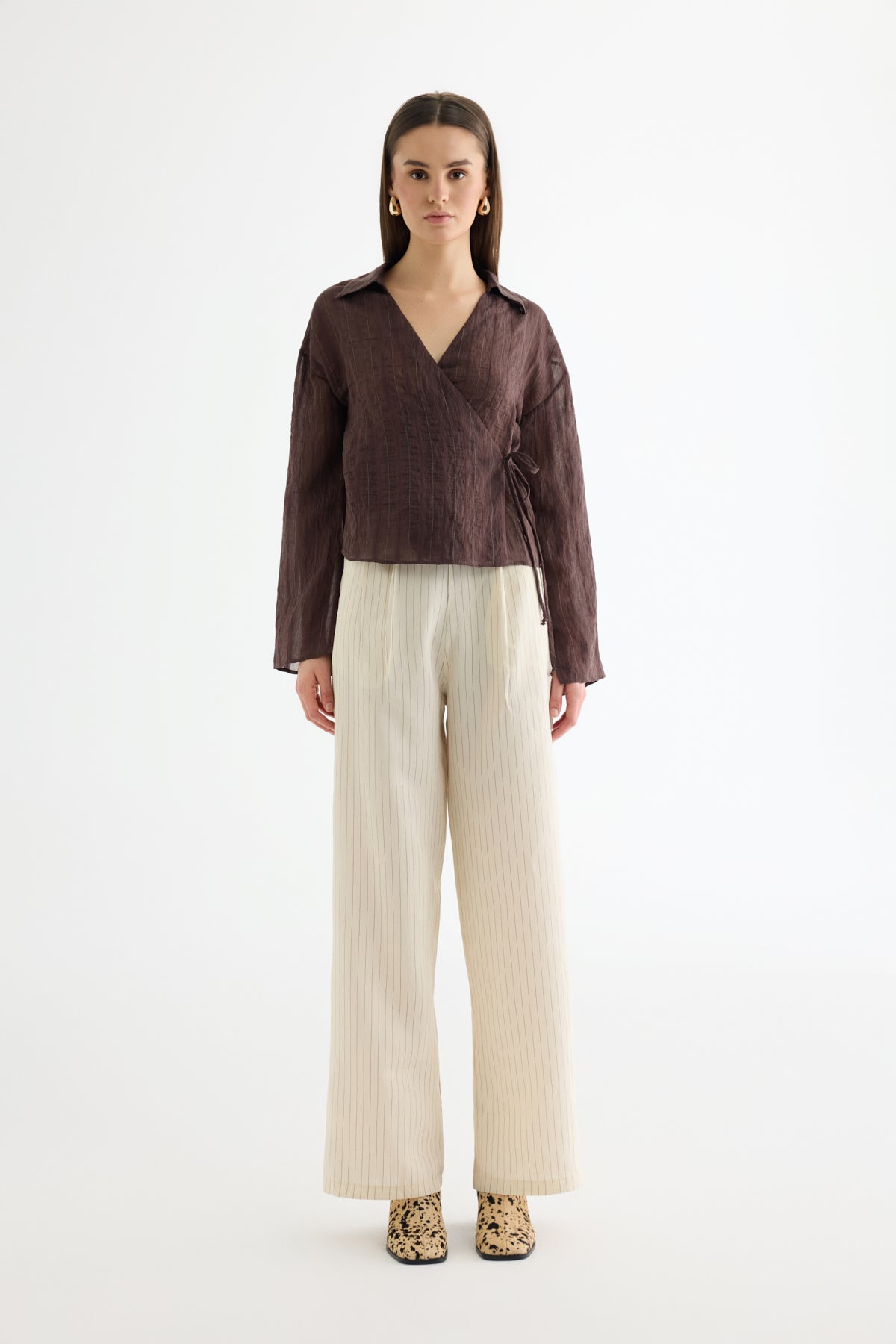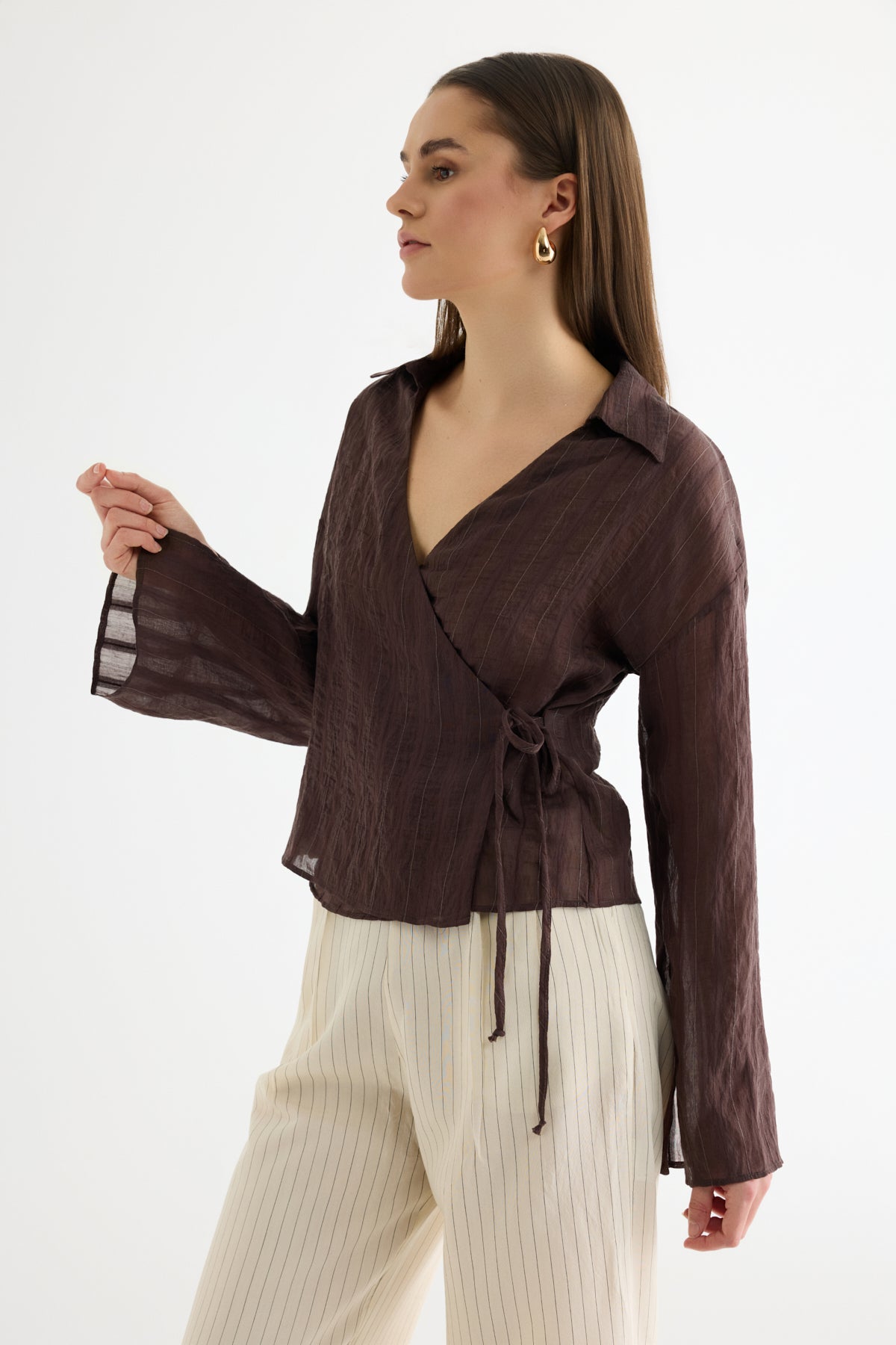 Anvelop Yaka Bağcıklı Tül Bluz Kahverengi