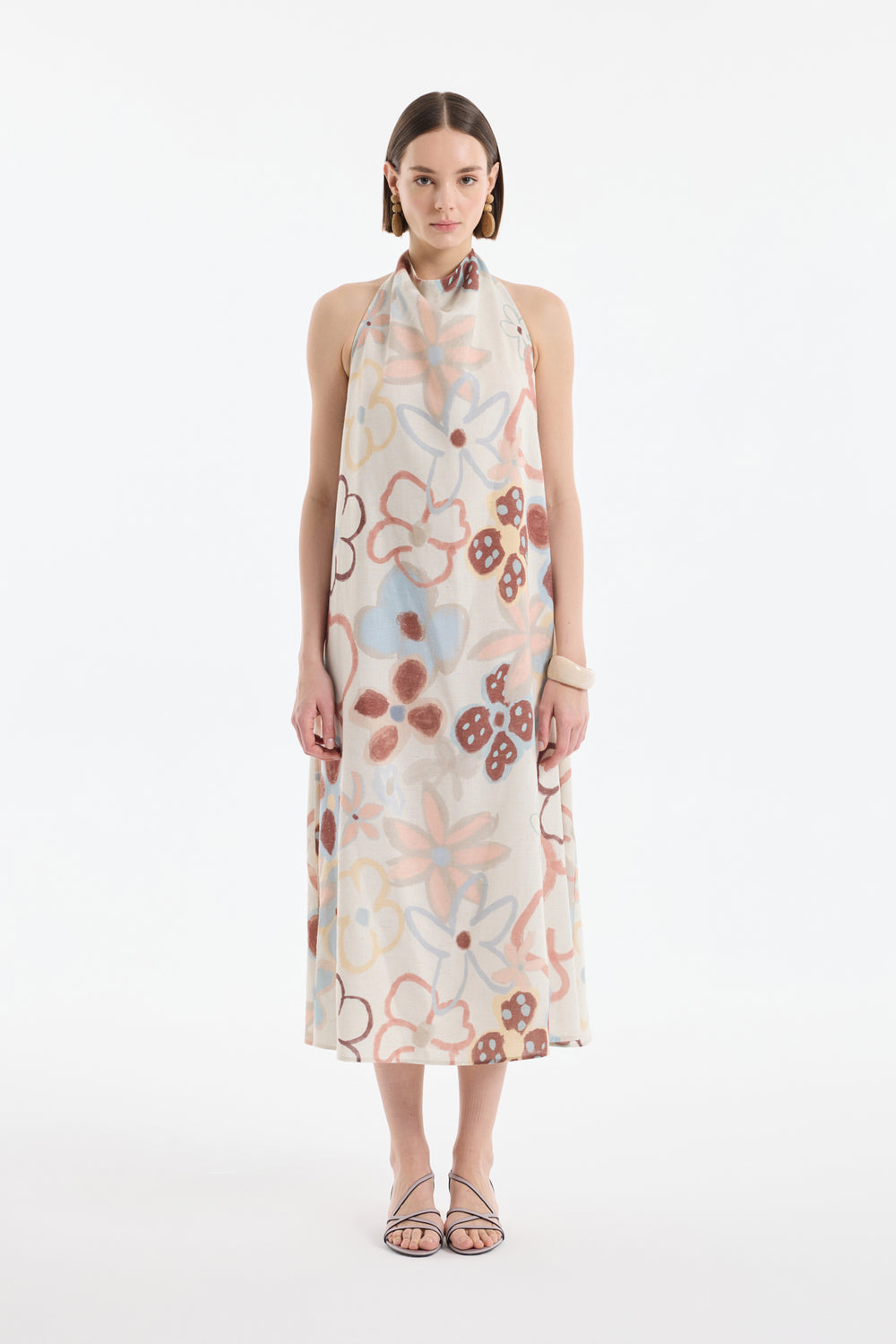 Boyundan Bağlamalı Sırt Dekolteli Desenli Keten Uzun Elbise Naturel