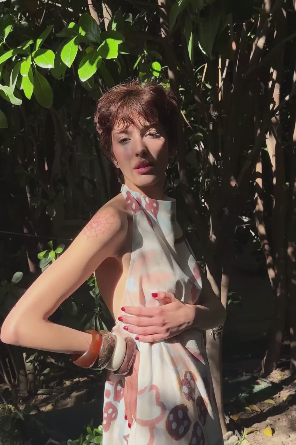 Boyundan düğme bağlamalı, renkli çiçek desenli, dökümlü yakalı, sırtı dekolteli lastikli, kolsuz, uzun boy, keten elbise.