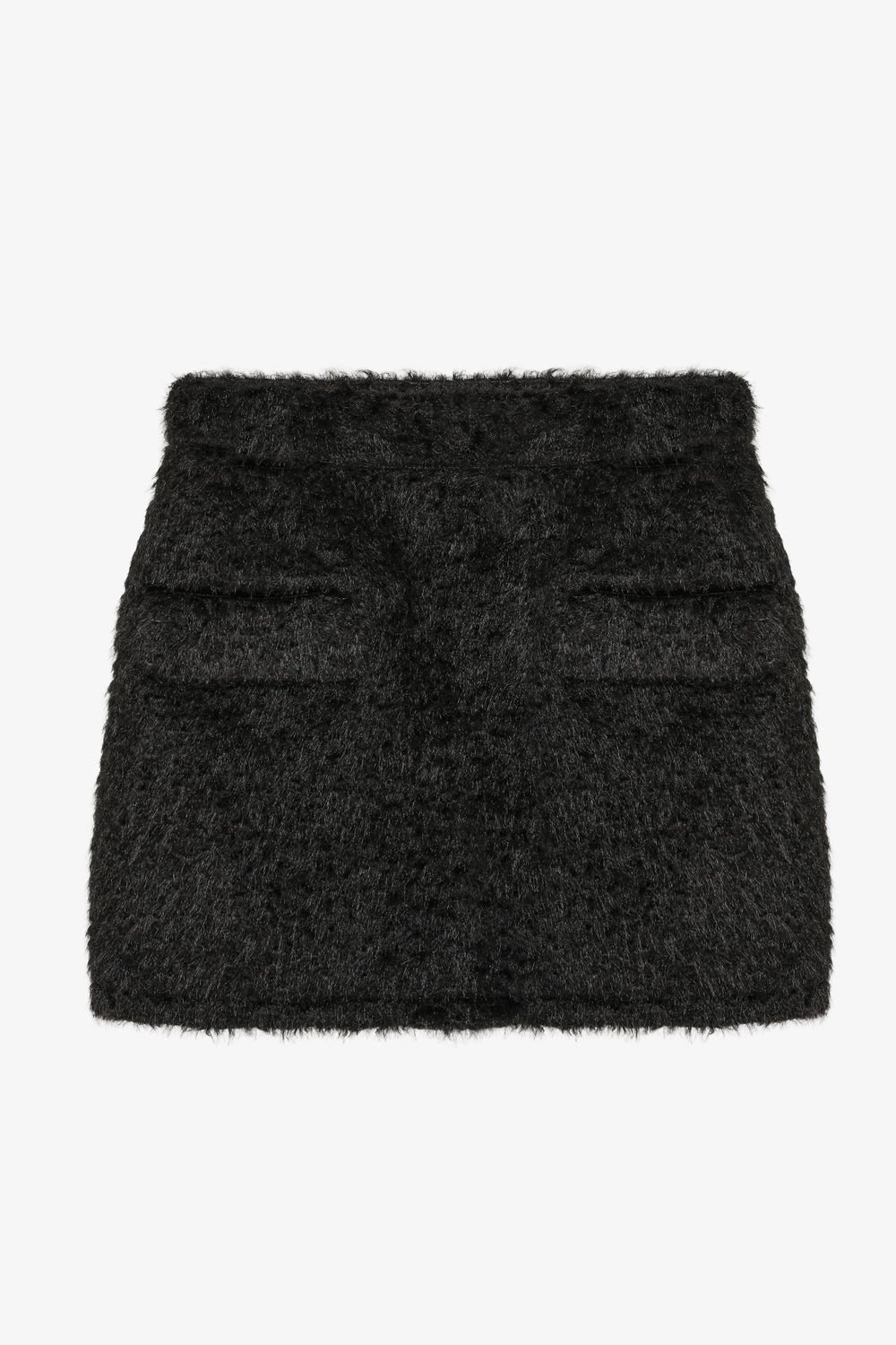 İçi astarsız, düz kesim, cep kapak detaylı, yandan fermuar kapamalı, modern görünüm sunan tüylü mini boy etek.