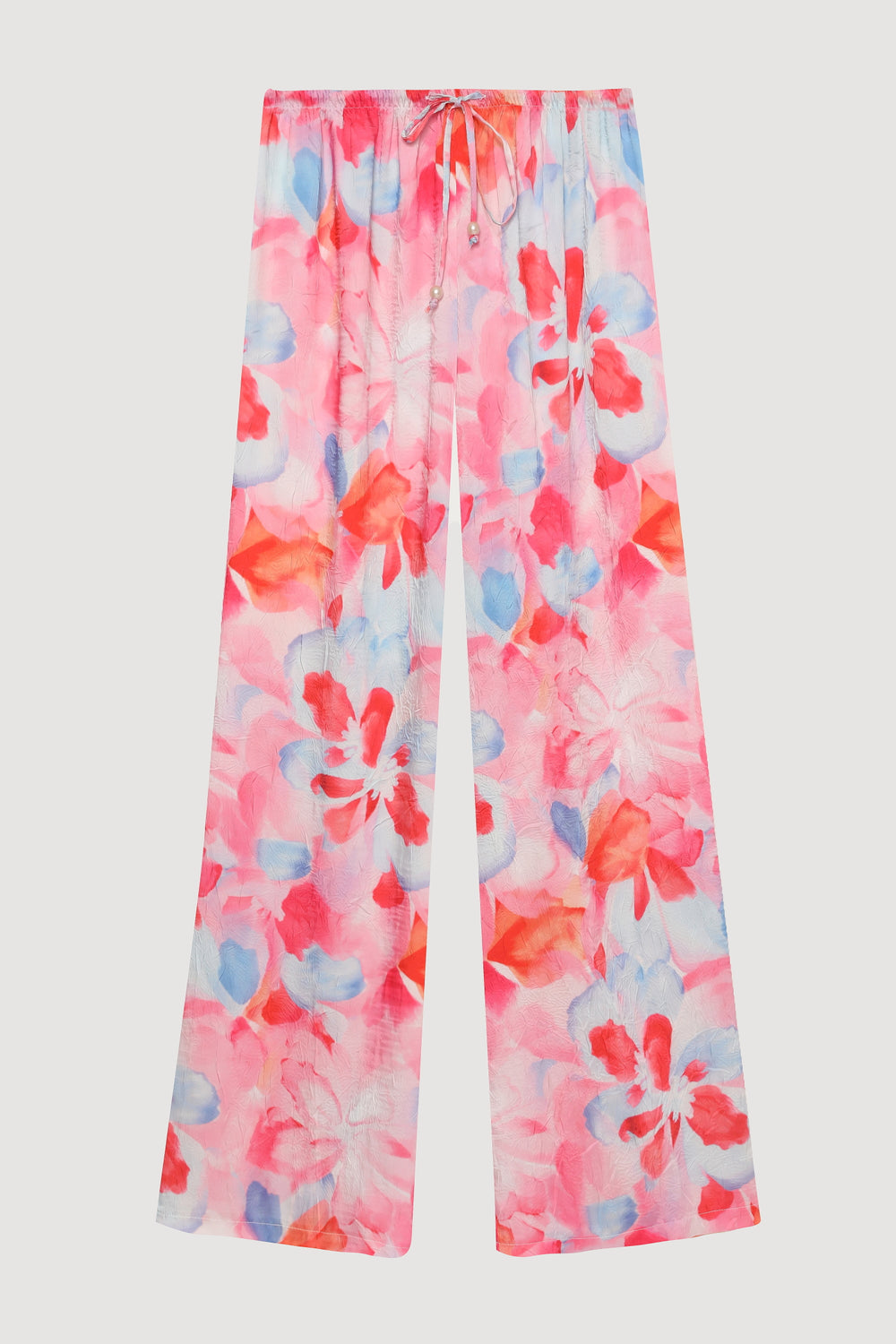 Renkli çiçek dokuma desenli, yüksek bel, lastikli bel bağcık ve boncuk detaylı, astarsız, ince kumaş, bol paça pantolon.
