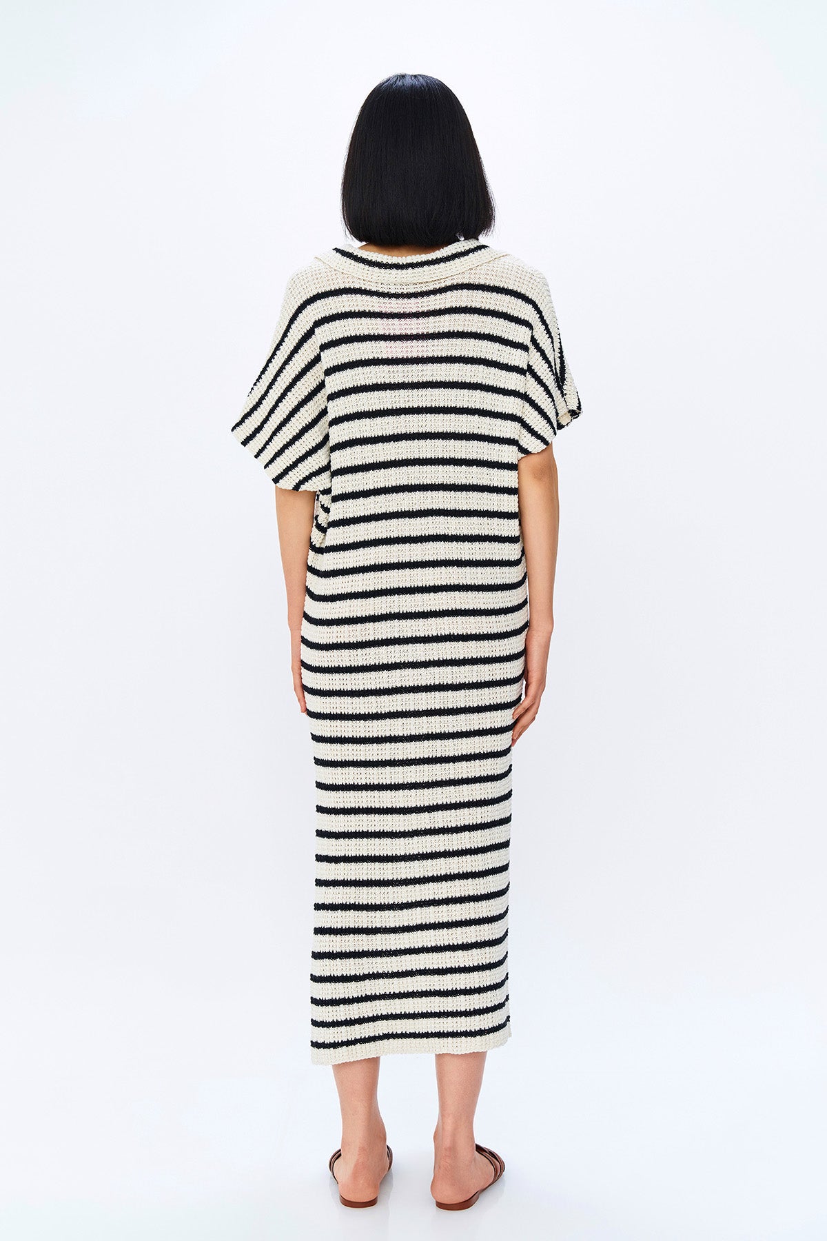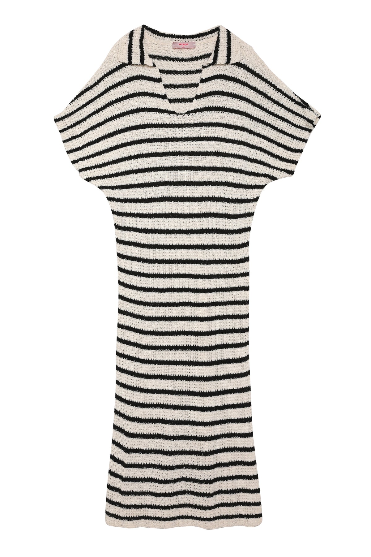Yün karışımlı, kısa kollu, v yaka, siyah ve beyaz çizgili detaylara sahip, yanları yırtmaçlı triko elbise.