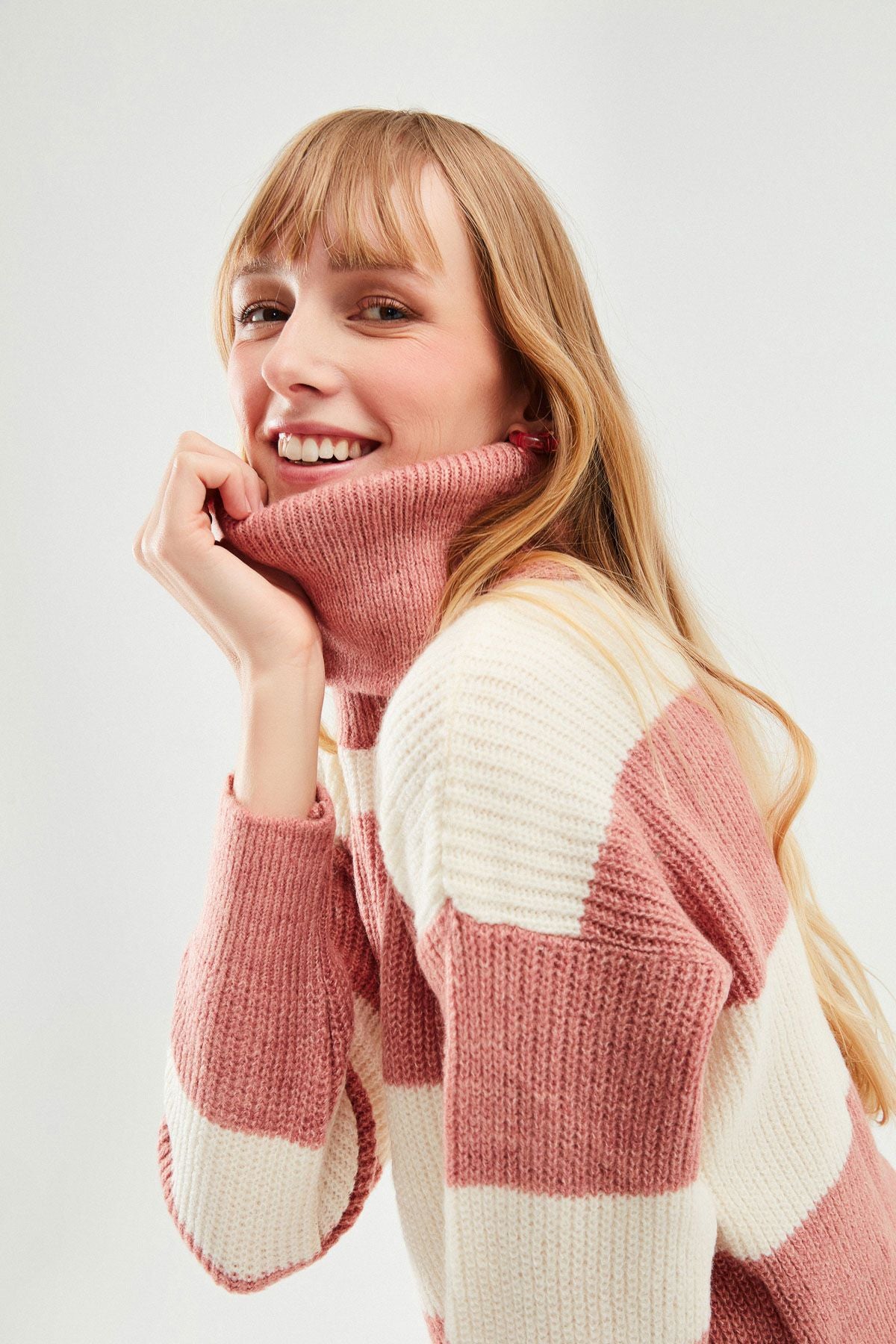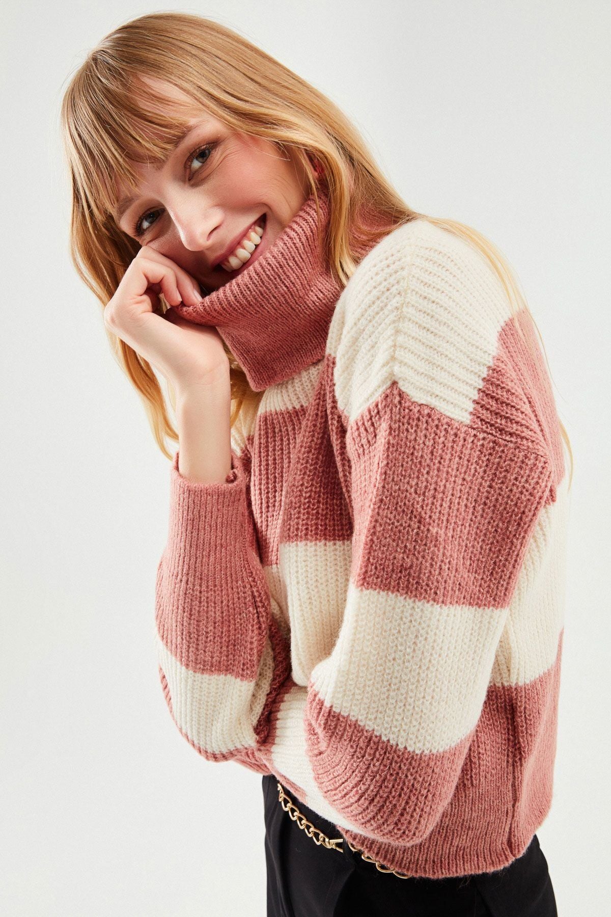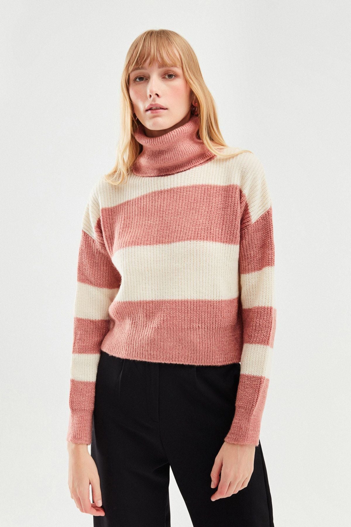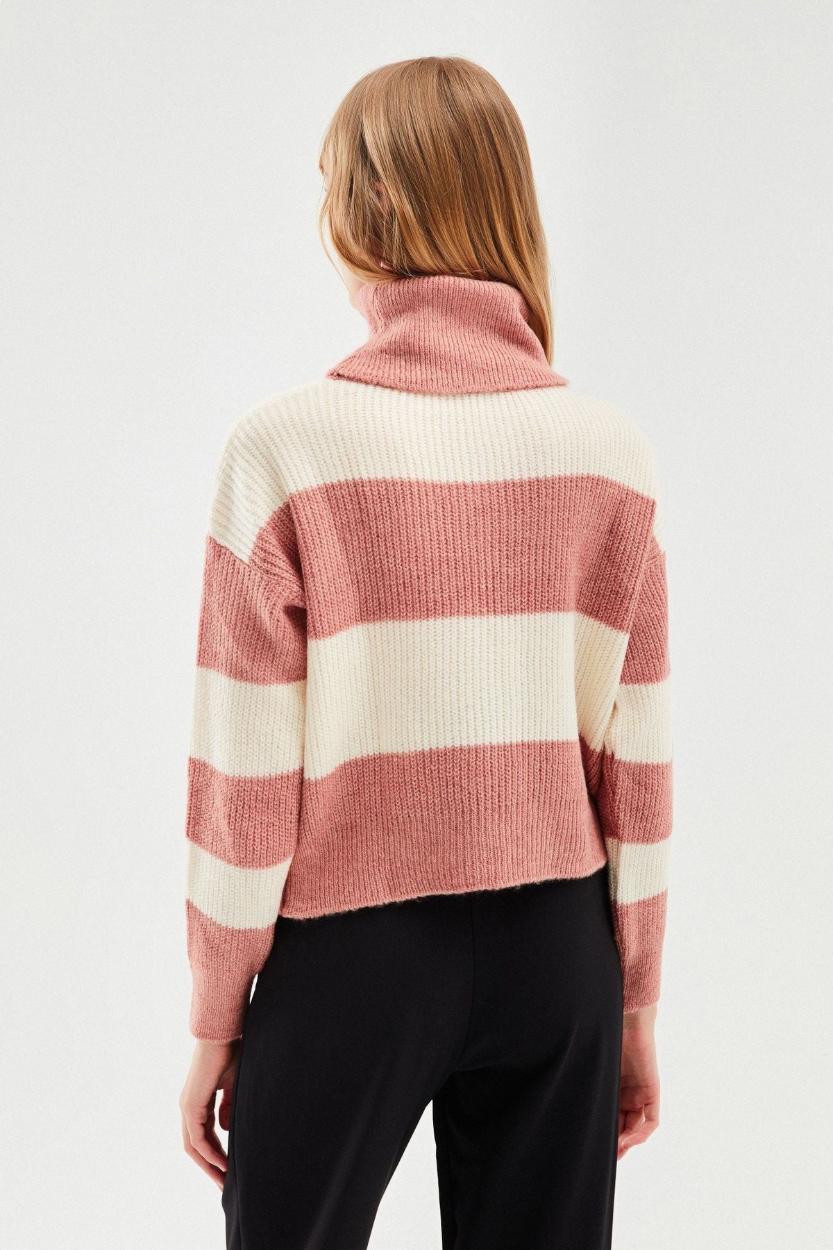Çizgili Triko Kazak Koyu Pudra