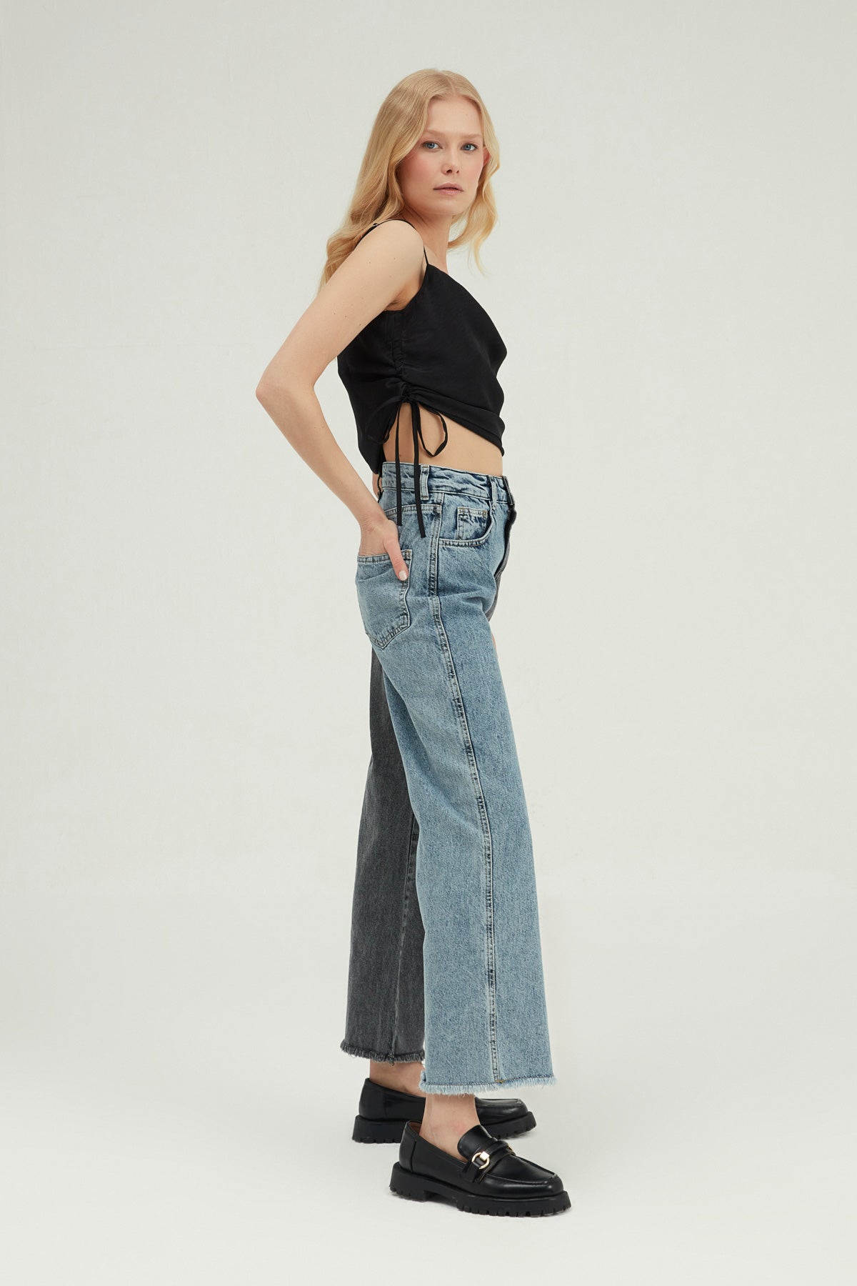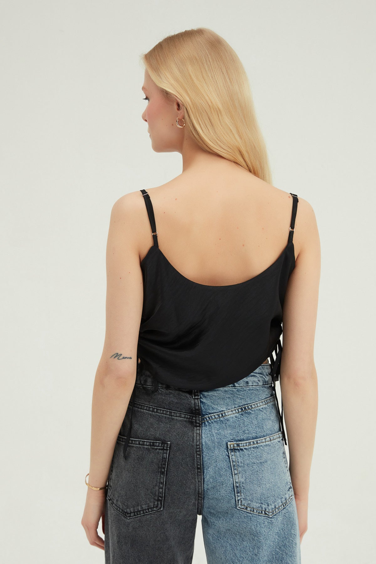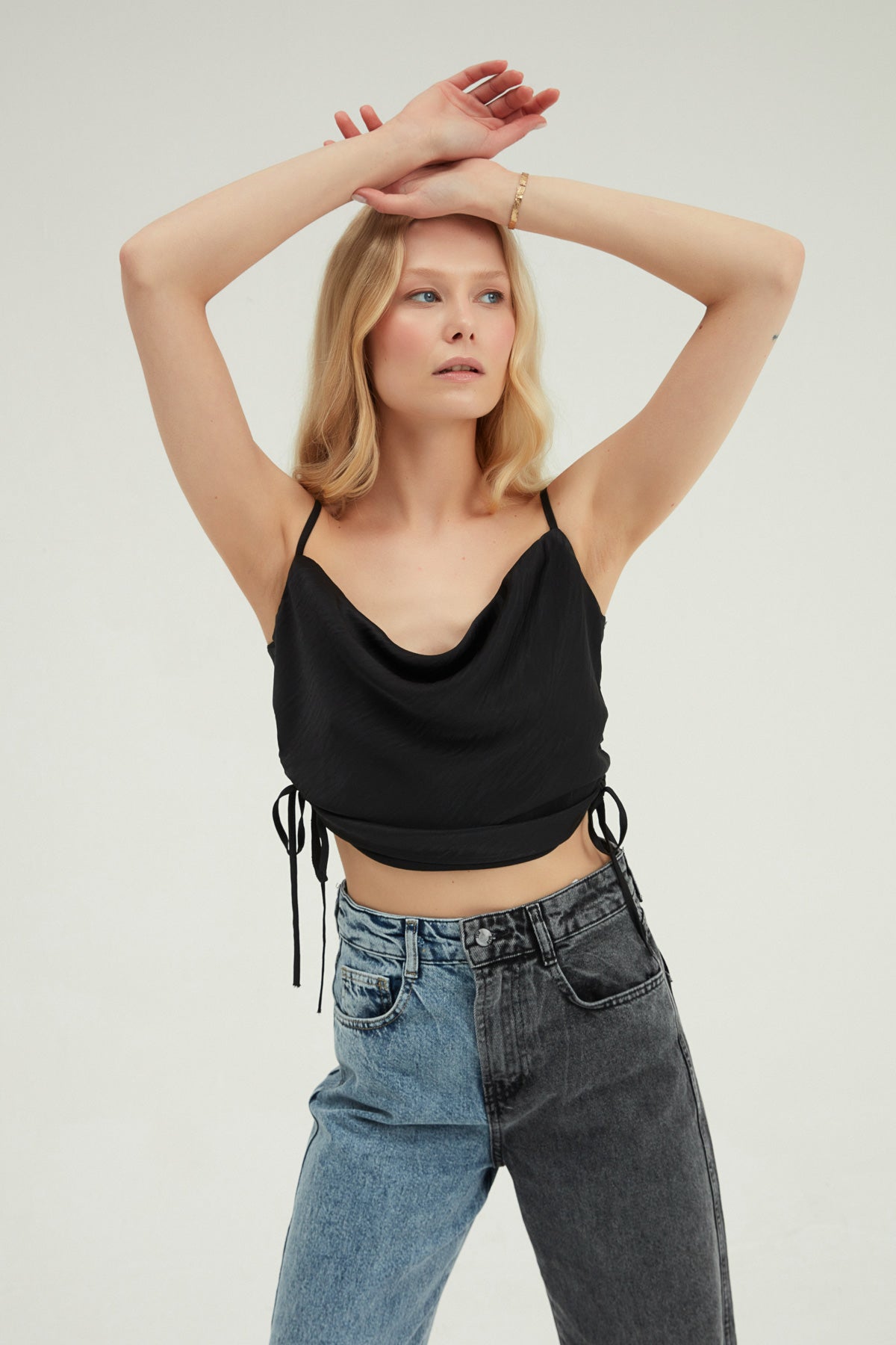 Ayarlanabİlİr İnce omuz askılı,yaka kısmı dökümlü degaje bluzun yan büzgü detayları büzgü mİktarına göre ayarlanabİlİr seçeneklİdİr.