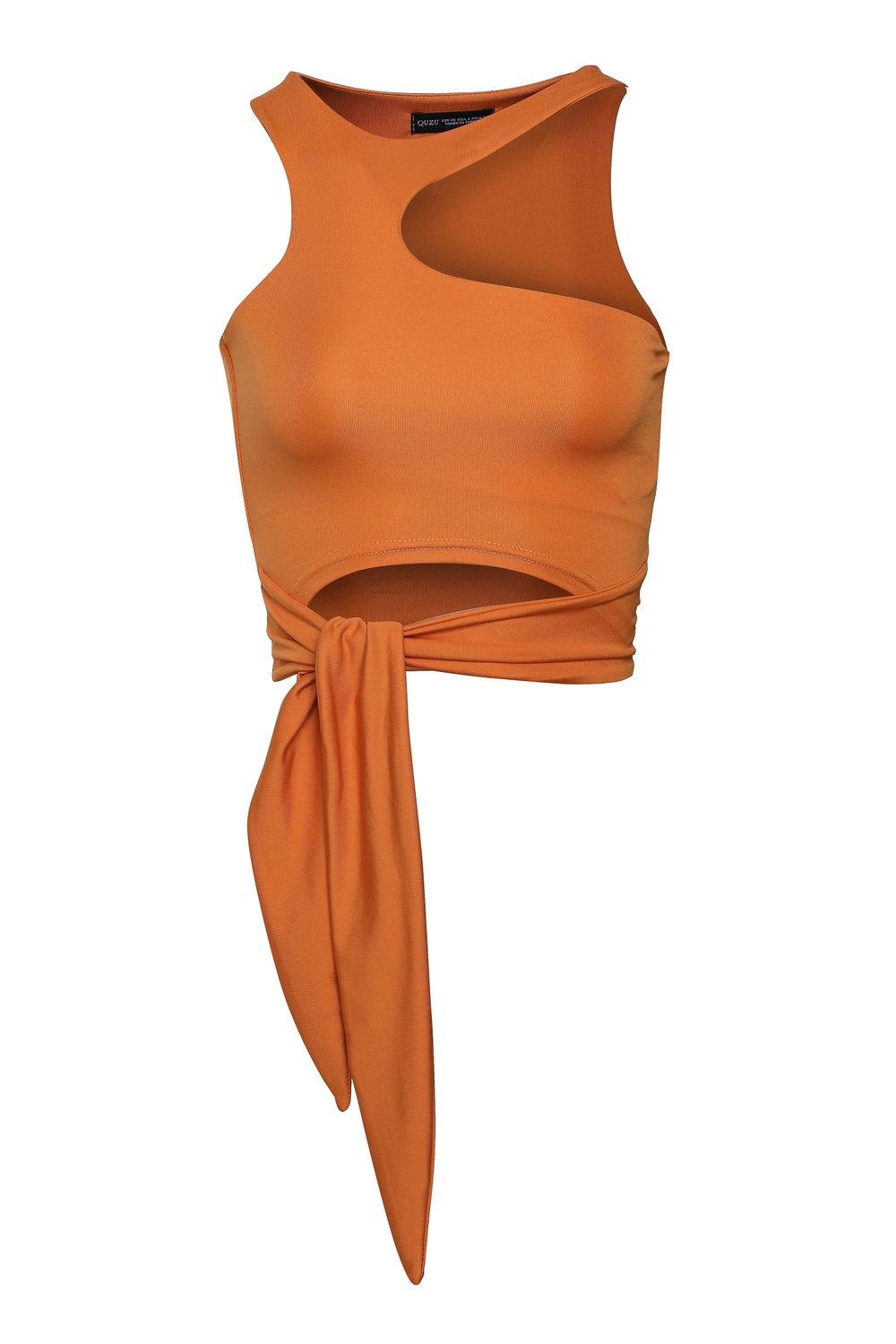 Boyundan geçmeli asimetrik kesim askılı crop bluz, bel kısmındaki kemer ip detayı ile isteğe göre bağlanabilir.