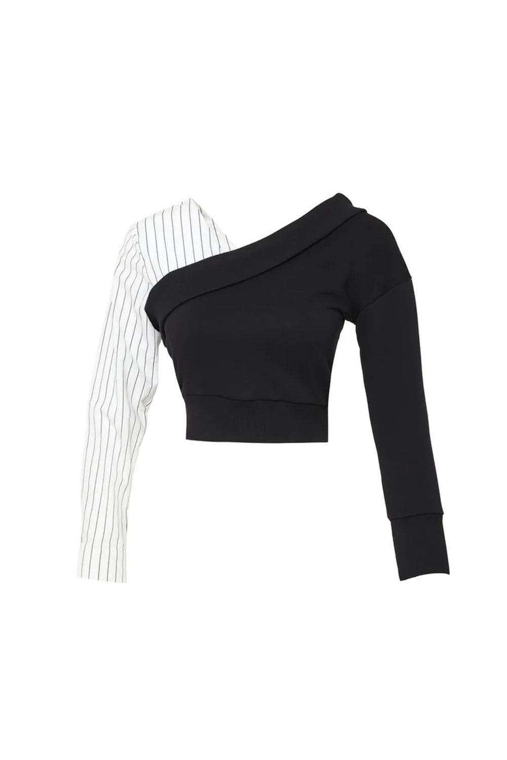 Asimetrik omuz detaylı, uzun kollu, çizgili,düşük omuz detaylı crop bluz.