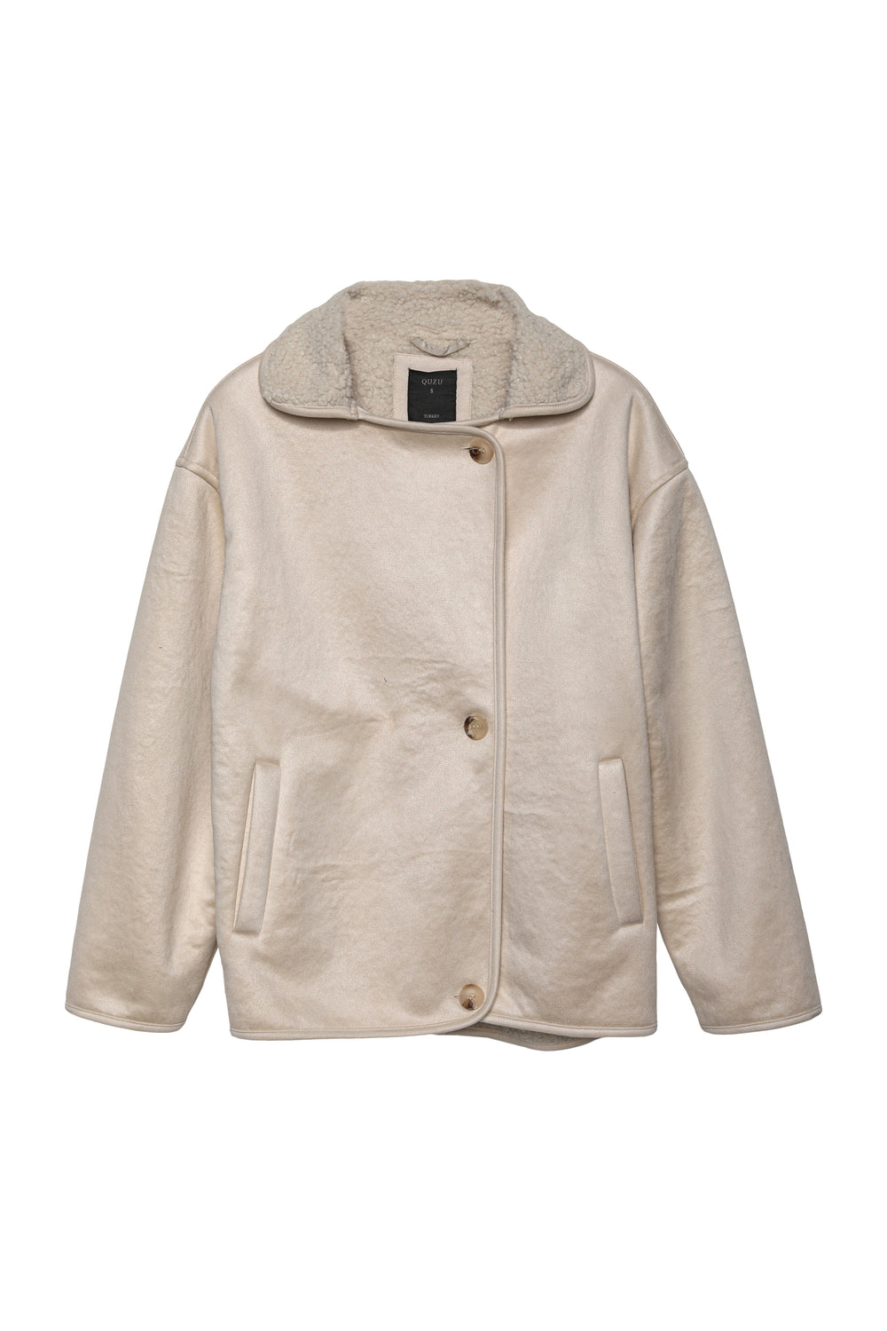 İçi peluş dokulu, düğme kapamalı, çift cepli, yakası peluş detaylı, uzun kol, oversize mont.