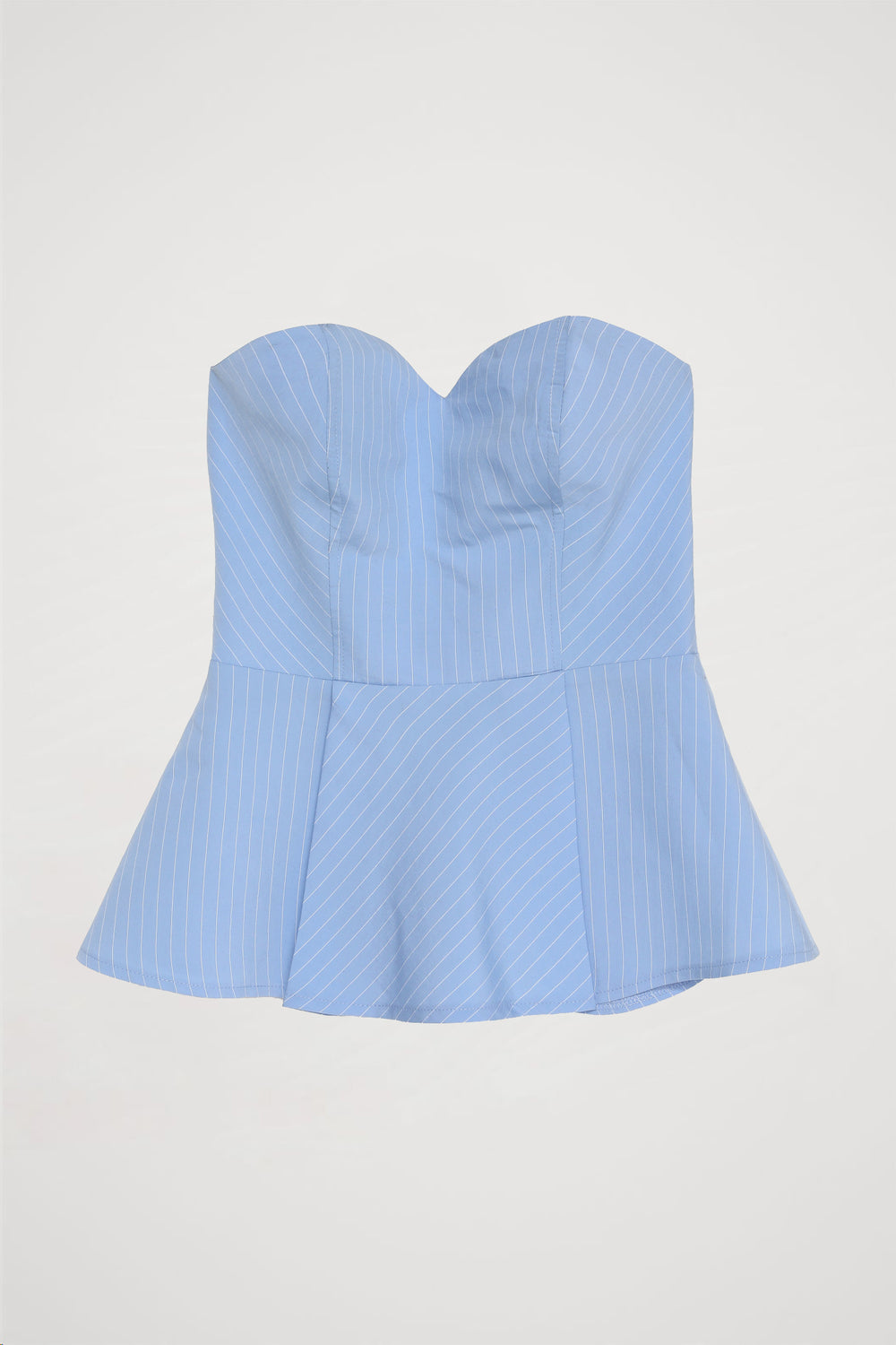 İnce çizgili desene sahip, straplez, sırtı lastikli, fermuar kapamalı, belden oturtmalı fırfır detaylı straplez bluz.