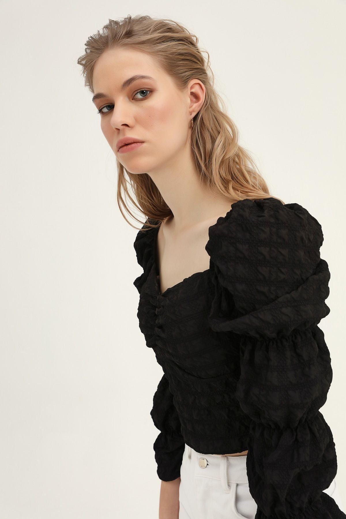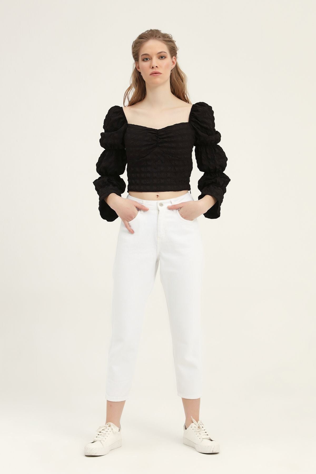 Kombinlerine hareket katmaya ve modunu yükseltmeye ne dersin? Trend alarmı veren kare yaka ve büzgü detayının bir araya geldiği crop bluz modeli ile sen de dolabına yenilik kat. Kare yaka crop bluz modelinin nostaljik ayrıntılarıyla geçmişten günümüze yolculuk yaparken, zengin ve hareketli kumaş yüzeyi ile tüm dikkatleri üzerine çekebilirsin. Straight jean’ler ve güçlü aksesuarlarla kombinini tamamlayabilirsin.