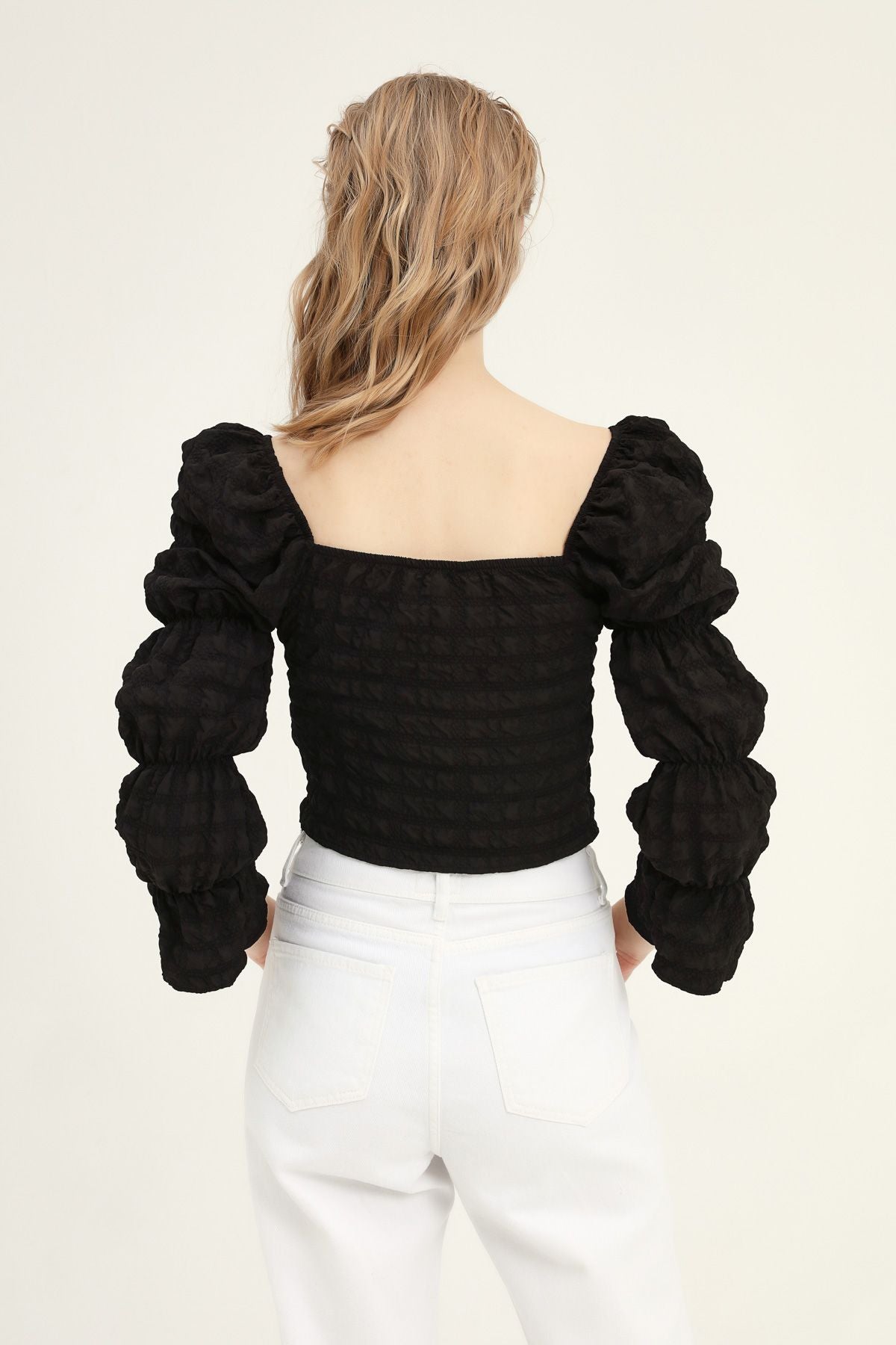 Kare Yaka Crop Bluz Siyah
