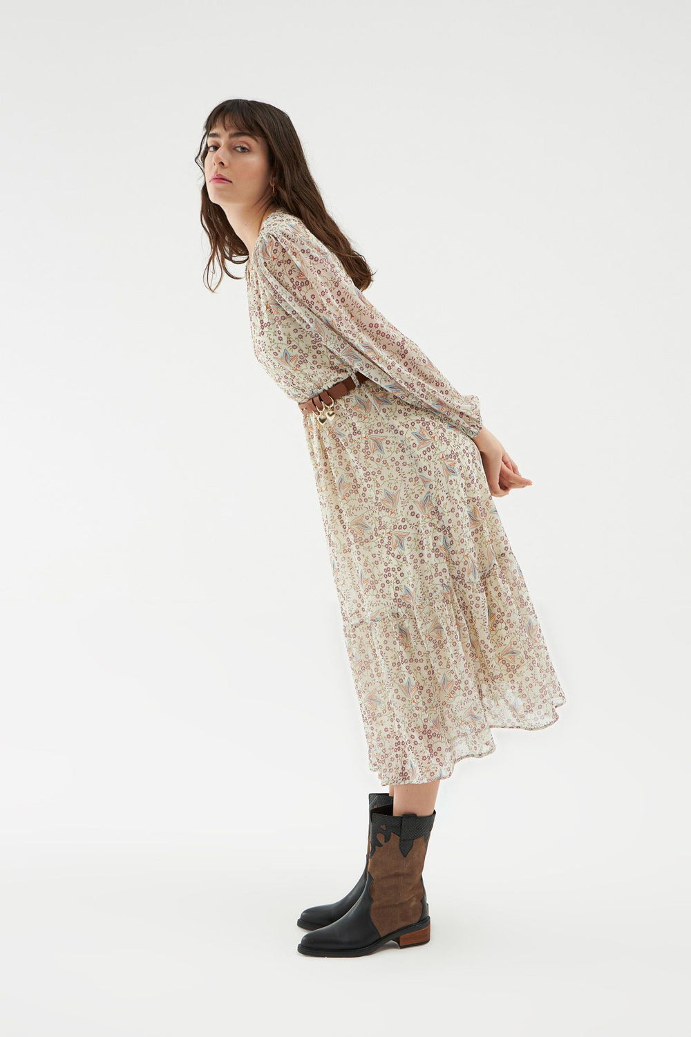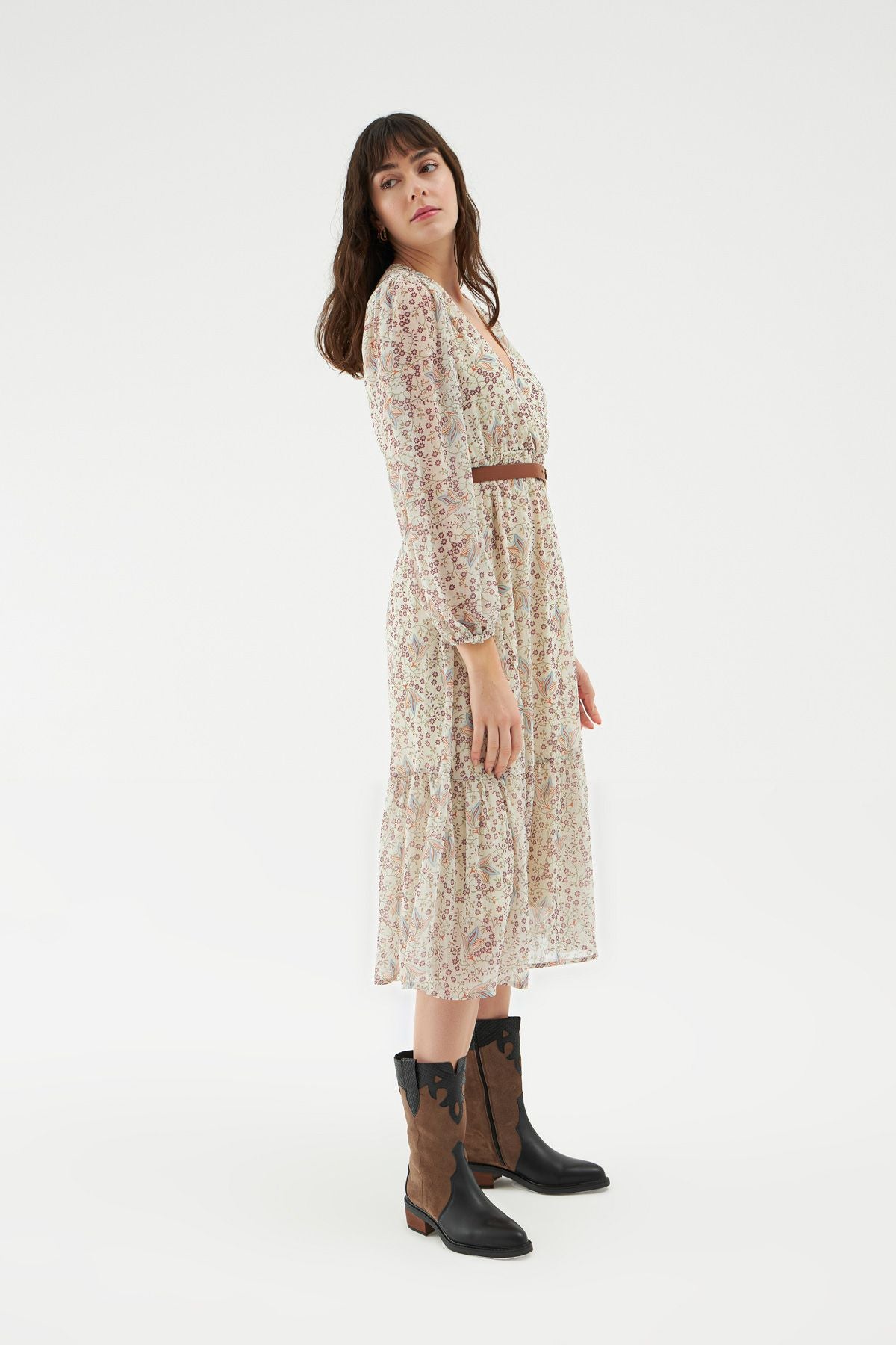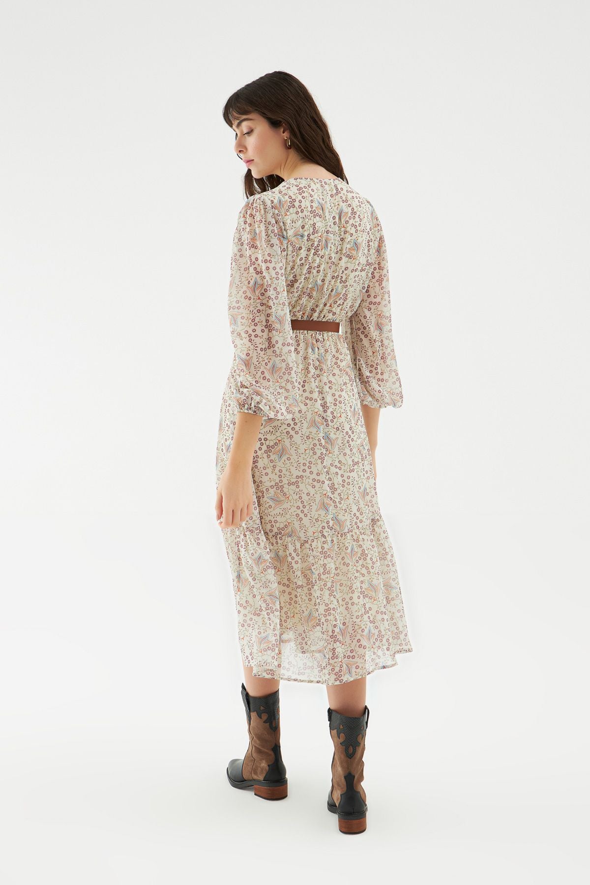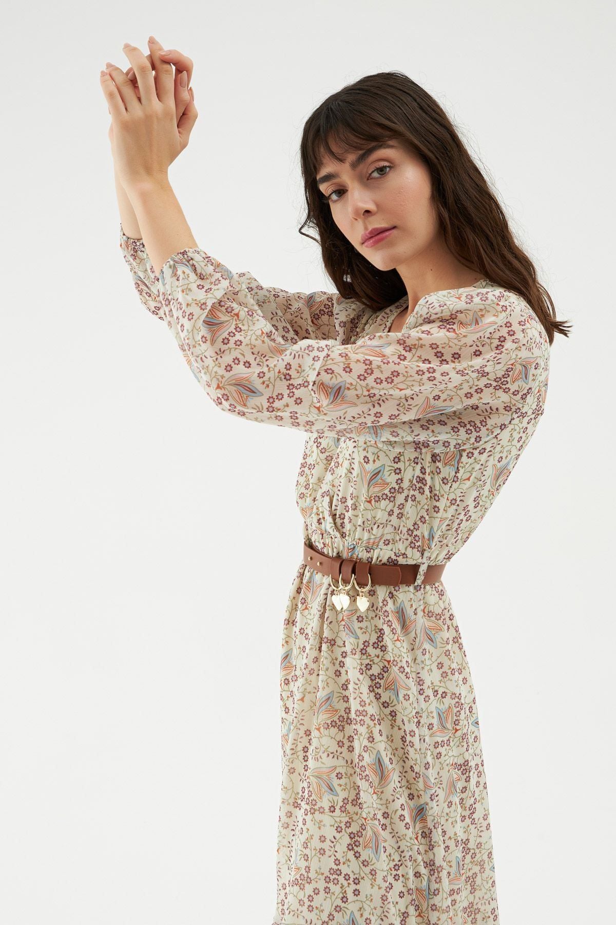 Çiçek desen elbise modeli kombinine enerji ve canlılık katacak! Enerjini yansıtabileceğin şifon elbise modelini sandelet giyererek kombinini tamamlayabilirsin. V yaka elbiseyi etek ucundaki fırfır detayı ve bel kısmındaki kemer aksesuarı ile hareketlendirdik. Uzun kol kesimi tüldür. Astarlıdır.