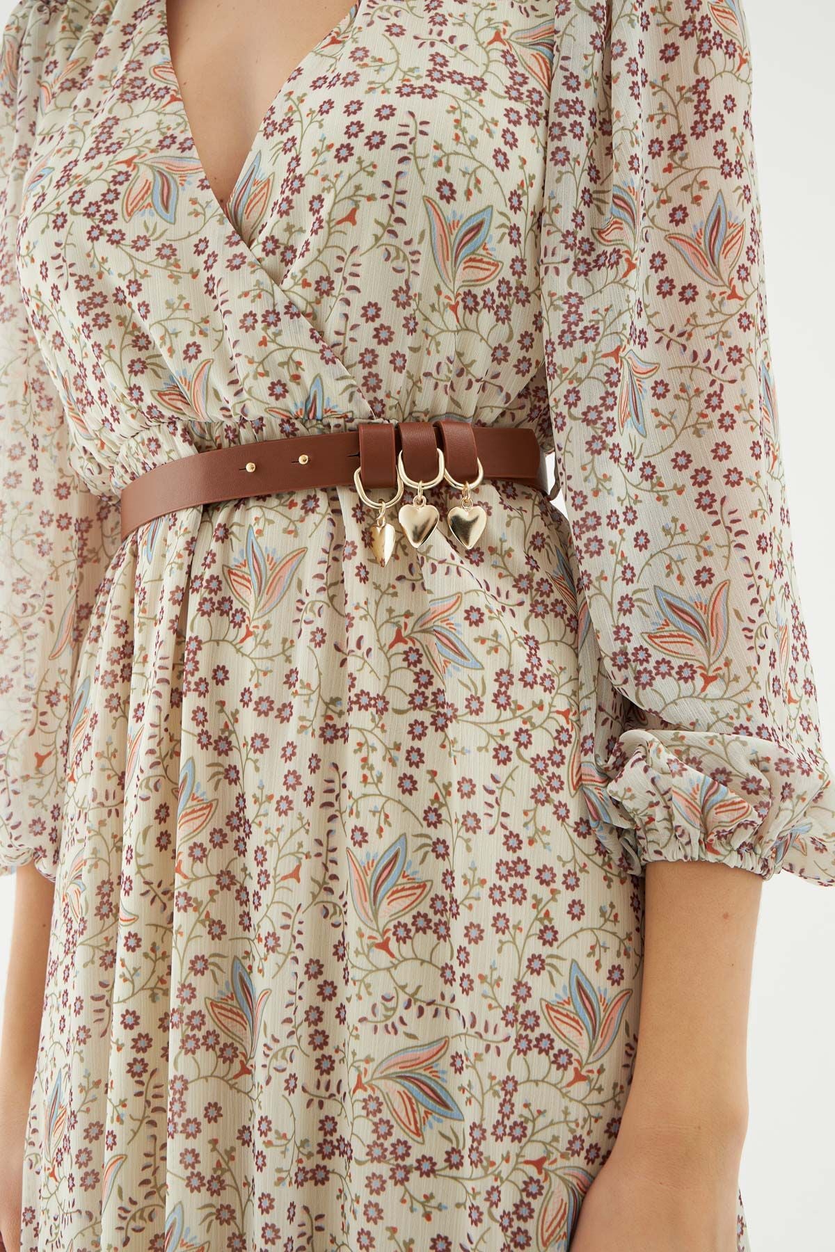 Kemerli Kruvaze Elbise Bej