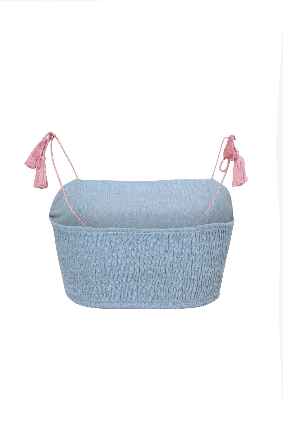 Nakışlı keten büstiyer,ayarlanabilir ip askılıdr. Askı detaylarında püskül bulunmaktadır. Bluz büstiyerin sırt kısmı gipelidir.
