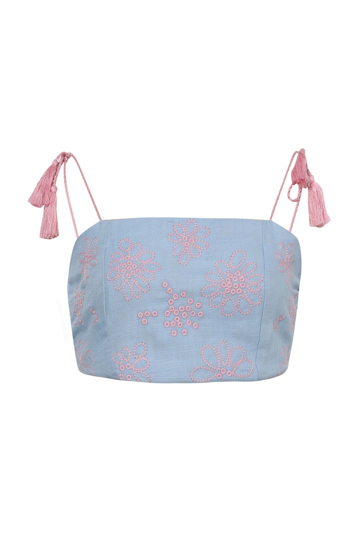 Nakışlı İp Askılı Büstiyer Keten Bluz Mavi