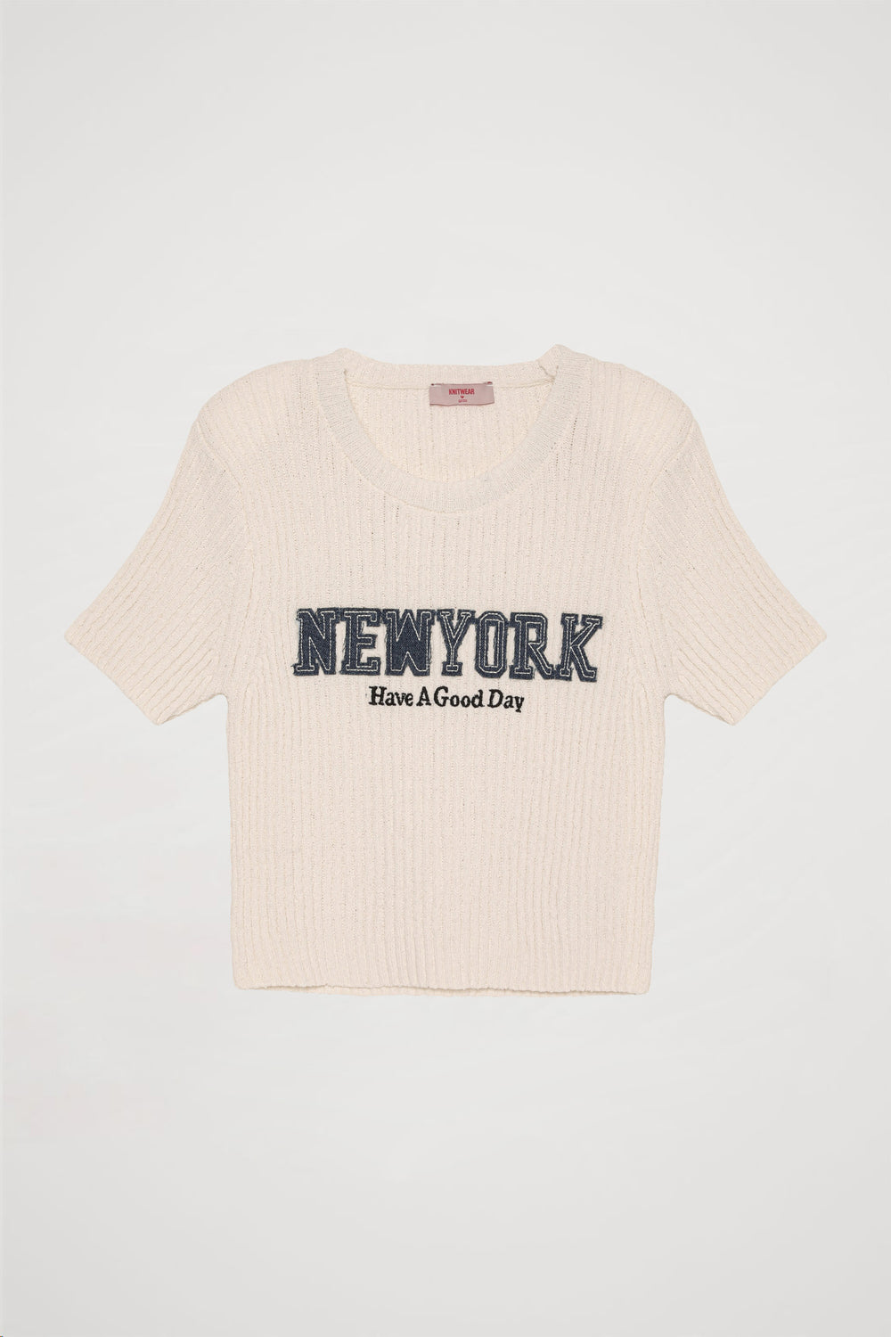 Ön yüzü "new york" yazı nakışlı, kısa kollu, omuzları vatka detaylı,yuvarlak yaka tasarımlı, modern ve şık crop triko modeli.