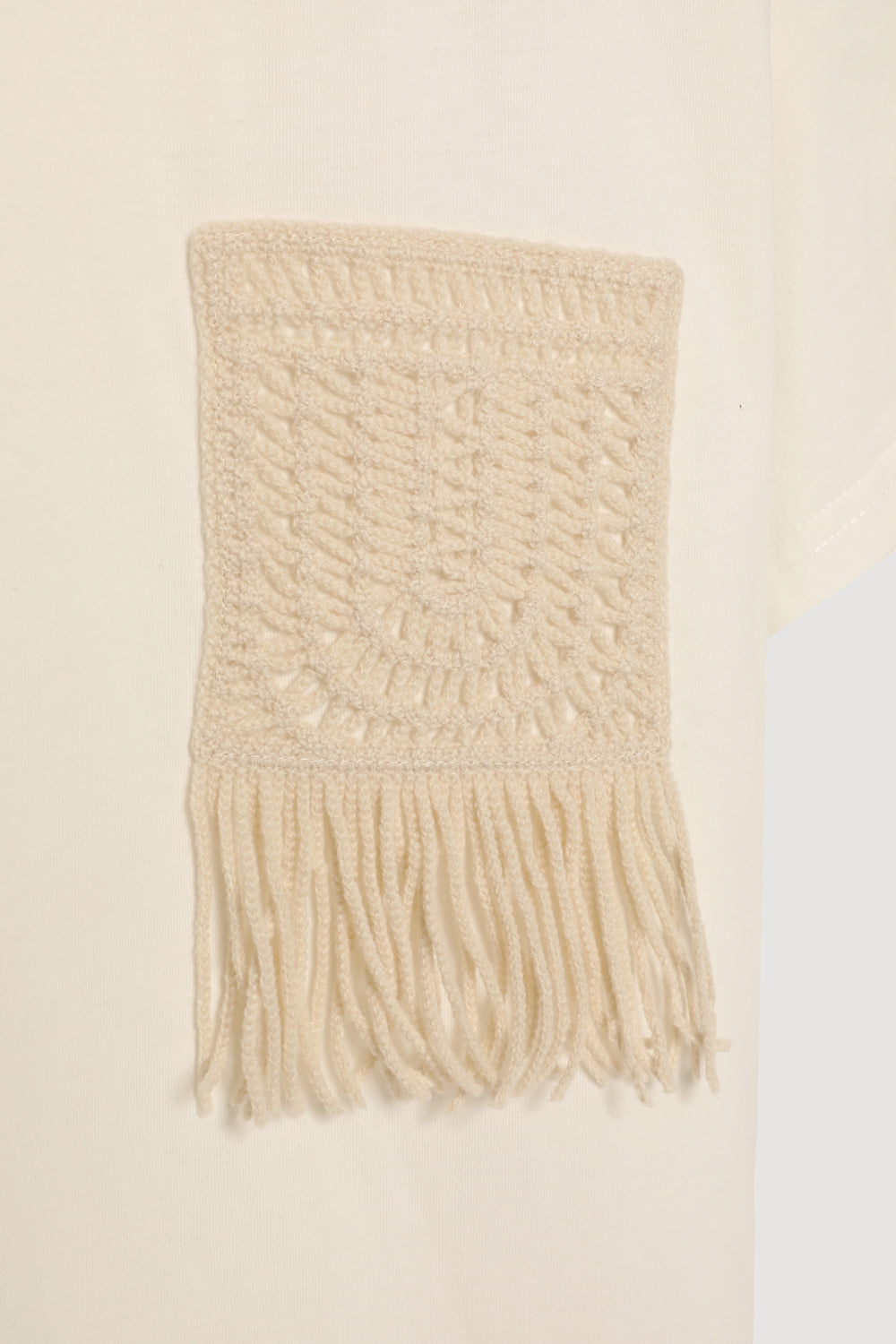 Yuvarlak yaka, kısa kollu, makrome püsküllü cep detaylı, modern ve sportif görünümlü rahat kesim tişört.