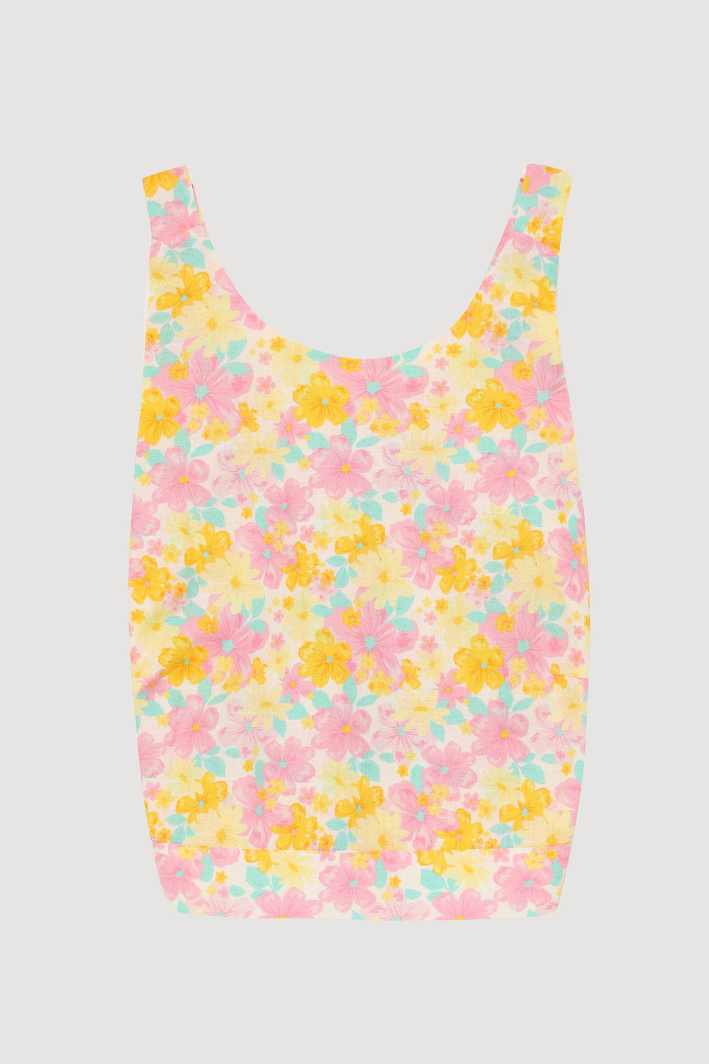 Renkli çiçek desenli, halter yaka, sırtı çapraz askılı, crop boy, astarsız, modern görünümlü kolsuz bluz.