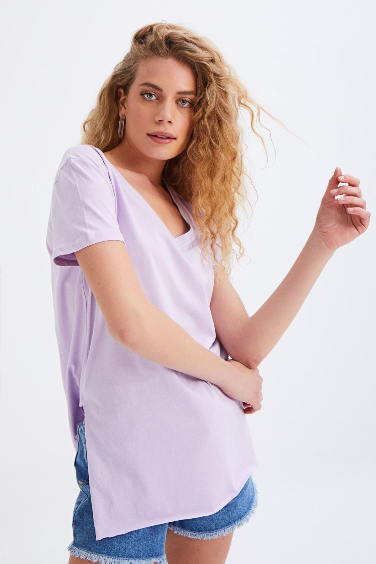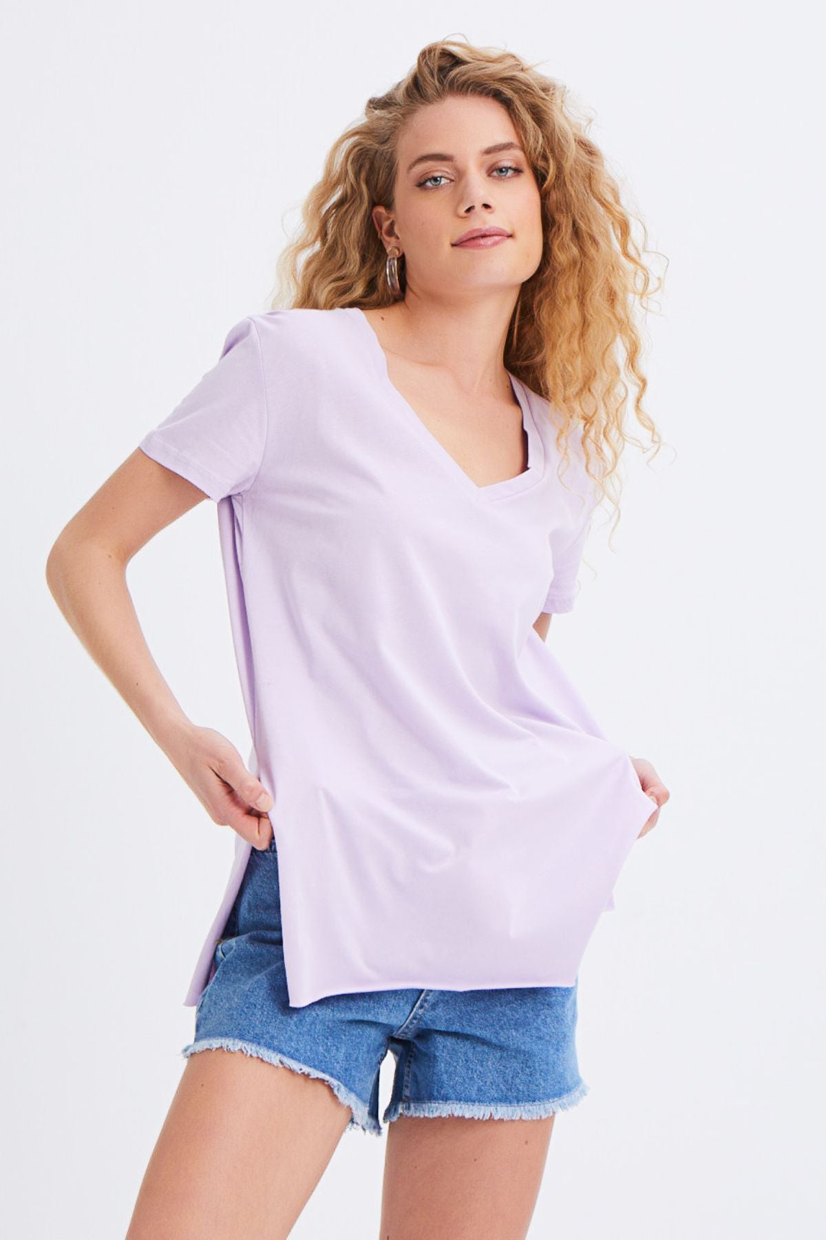 V Yaka Yanı Yırtmaçlı Tişört Lila